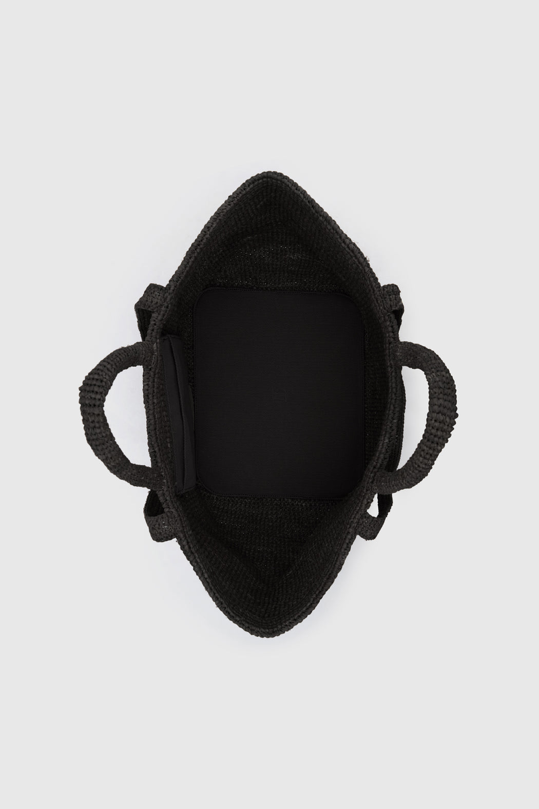 CAMILLA AND MARC Amir double-handled straw tote with embossed monogram logo. Faux leather base. Press stud closure.