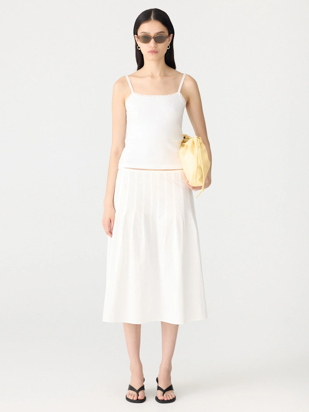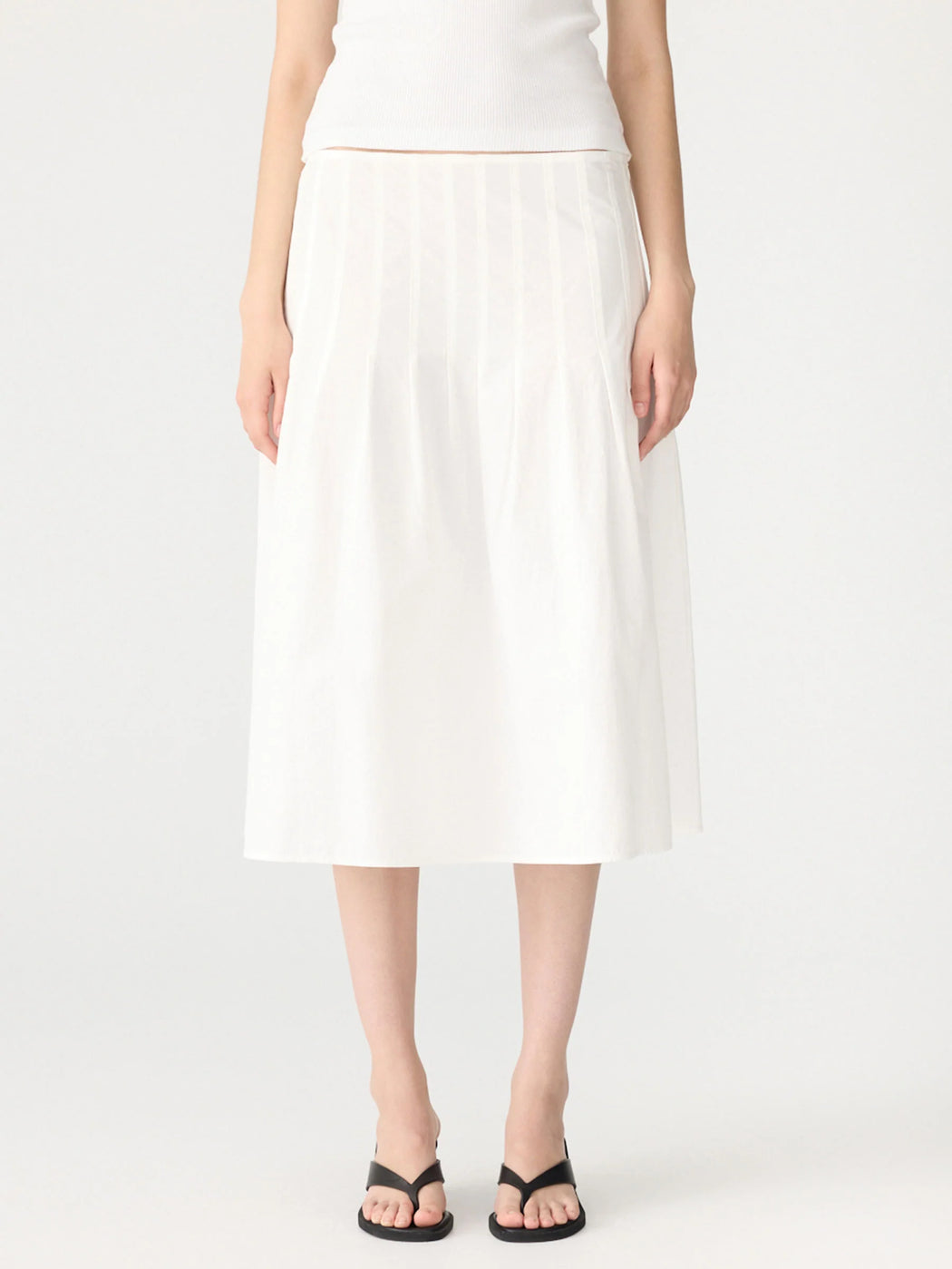 A seasonal essential, the Crushed Cotton Pleated Skirt is crafted from a softly crushed cotton, chosen for its lightweight feel and ability to hold shape. Designed for a regular fit in a midi-length silhouette, this bandless pleated style features in-stitched pleats for clean structure and a side zip closure. Finished with a minimal internal hip-facing along the top edge for subtle structure.
