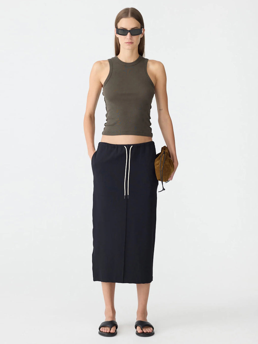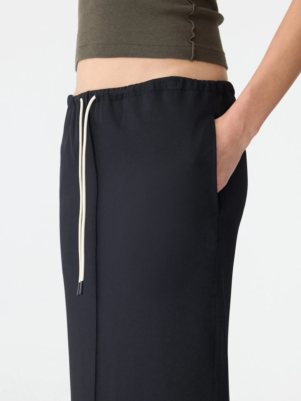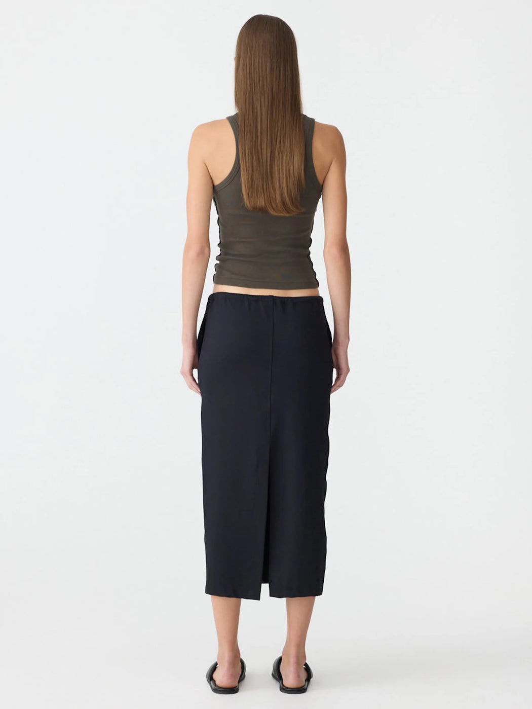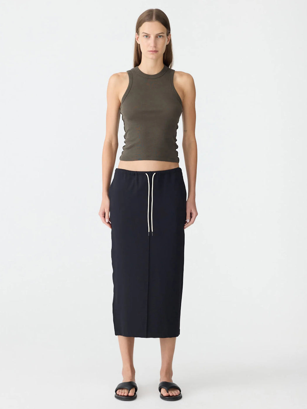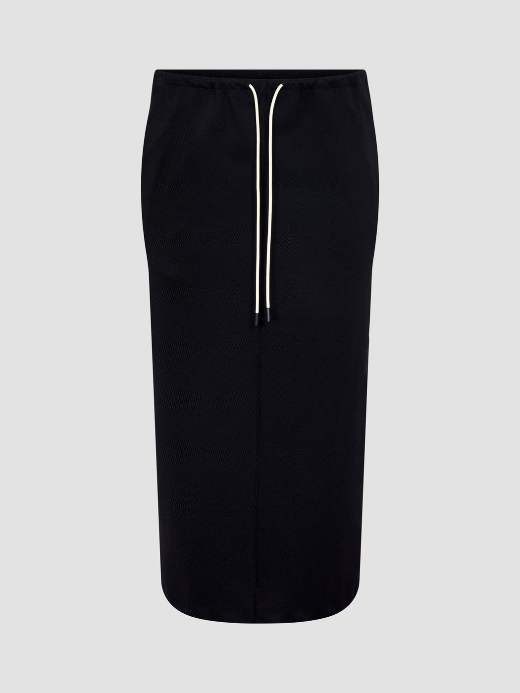 The Stretch Twill Minimal Skirt is designed in a slim, tapered pencil silhouette with a long midi length. Featuring a clean pinstitch detail through the centre front and a back split for ease of movement. Finished with a pull-on elasticated waistband, thin drawcord and streamlined waist finish. Crafted in technical stretch twill.