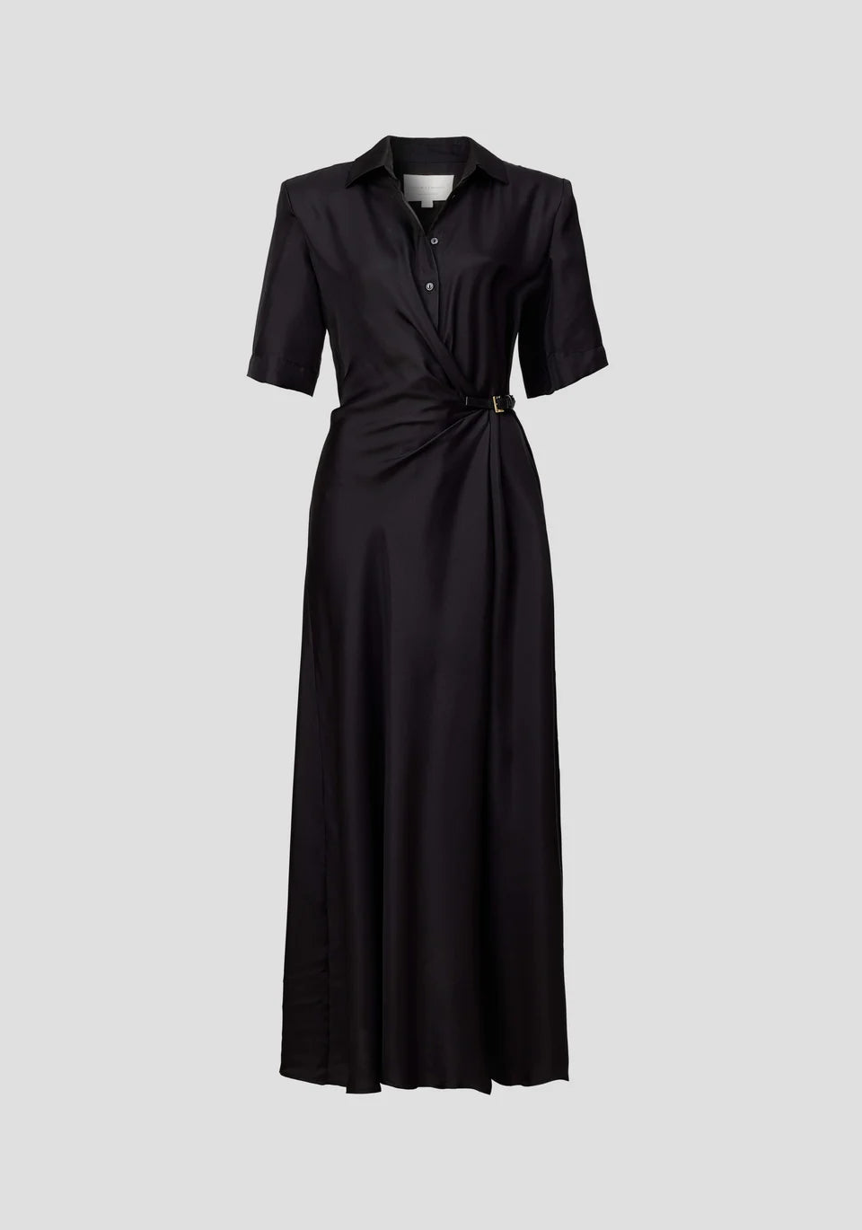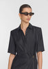The Scorpius Dress, crafted in luxurious black silk twill, reimagines the shirt dress with modern detailing. Featuring a structured collar, relaxed short sleeves and an engineered wrap design with a branded leather belt, it’s finished with an asymmetrical hem and front split. Effortlessly refined, it’s the perfect workwear style that will carry you into the evening.