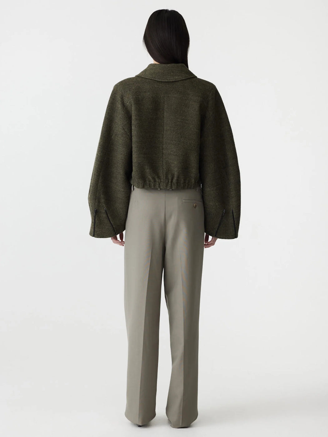 The Cropped Boiled Wool Jacket is a structured outerwear style defined by a cropped silhouette and softly textured finish. Crafted from an Italian wool-blend bouclé with a contrast jersey backing, it features a concealed centre front zip with an exposed button at the neckline. Designed with curved sleeves and zip openings at the cuffs to create volume. Finished with front welt pockets, an elasticated hem and full lining.