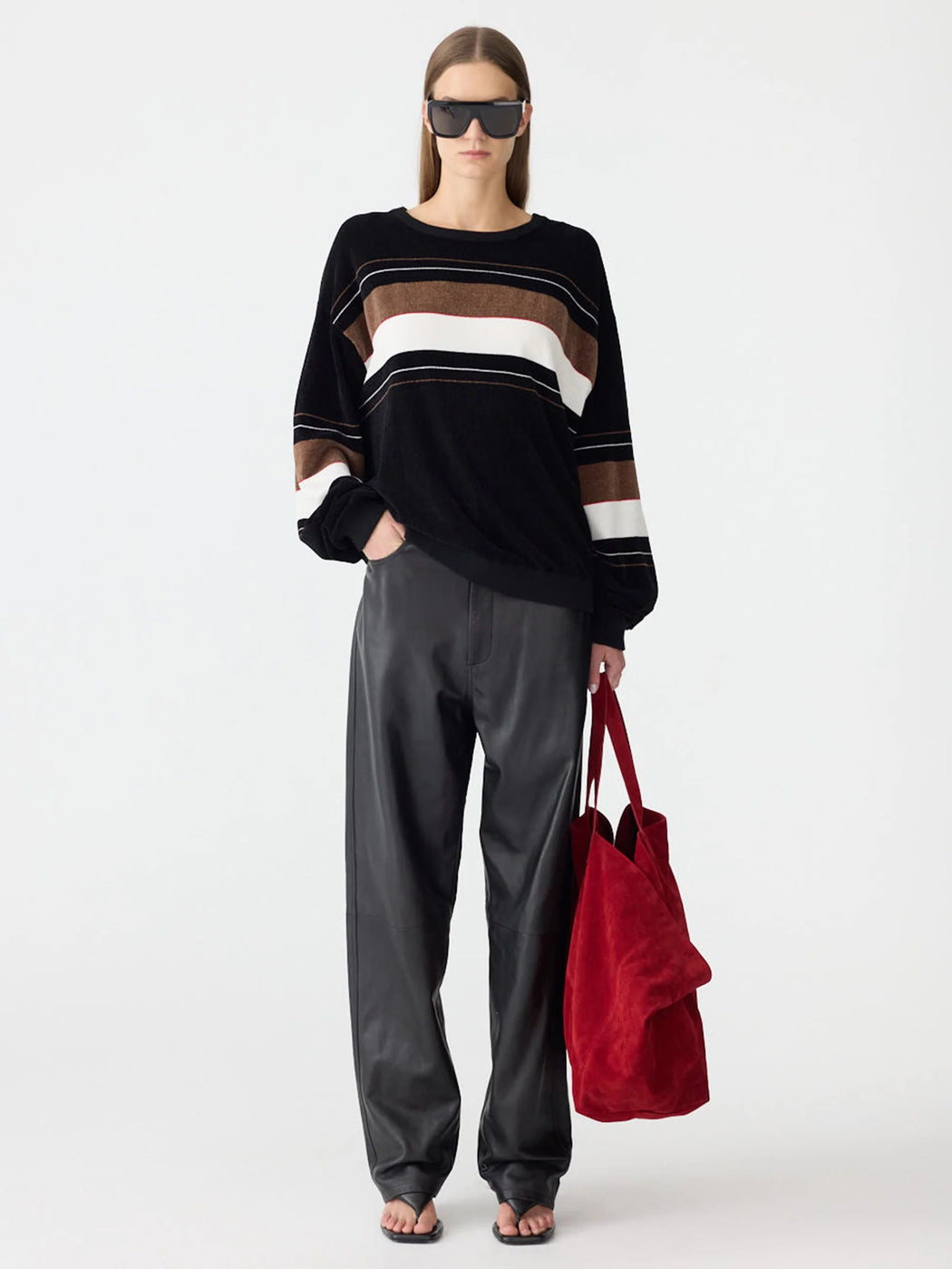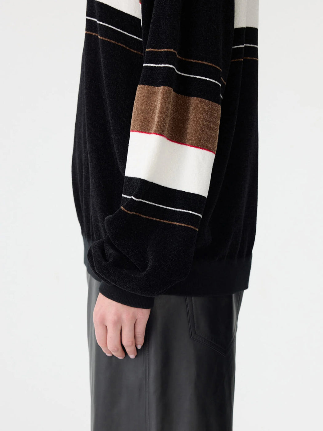 The Velour Crew Neck Knit is a universal, unisex classic designed with a relaxed crew neck silhouette. Crafted in a textured velour knit, featuring contrast knitted stripe detailing for a subtle athletic edge. Designed as an elevated everyday layer with a soft, tactile hand feel.