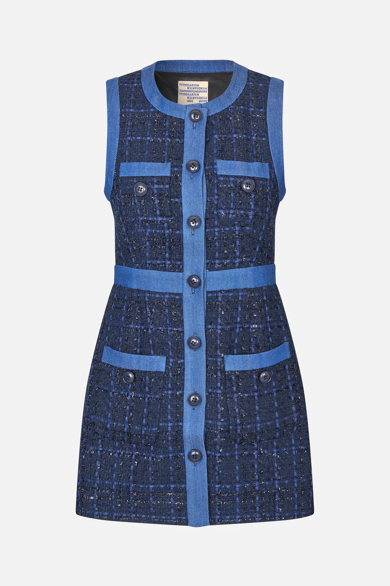 This sleeveless bouclé minidress features button closures in the front and four patch pockets. The dress is fully lined.