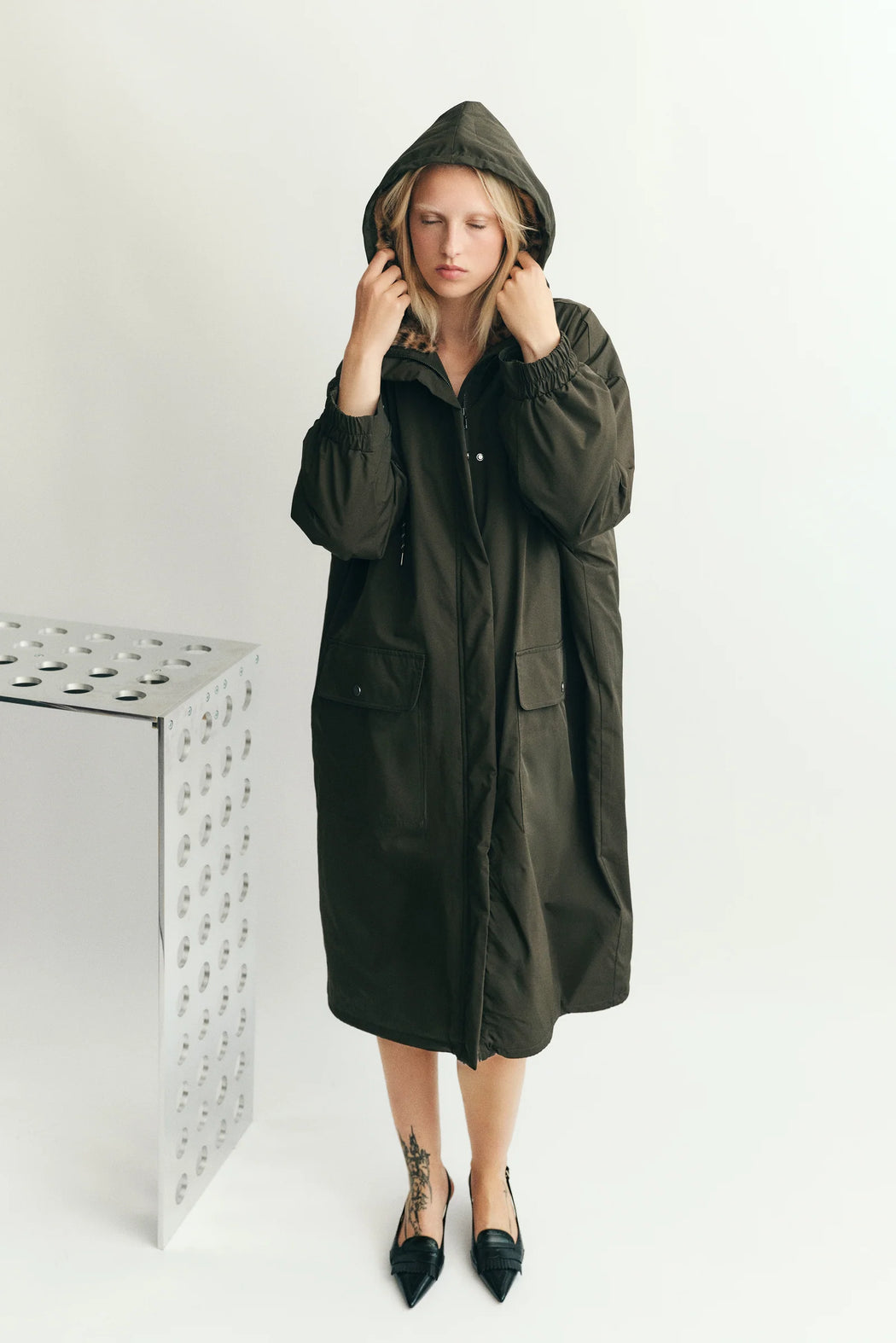 The Demi Coat is comfort wrapped up in style. The long coat has an oversized fit that is fully lined with leopard faux fur lining. The coat has many practical details such as a hood with adjustable drawstring, hidden zipper with press-buttons and multiple pockets. The perfect outerwear to keep you company throughout your day.