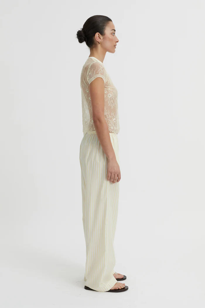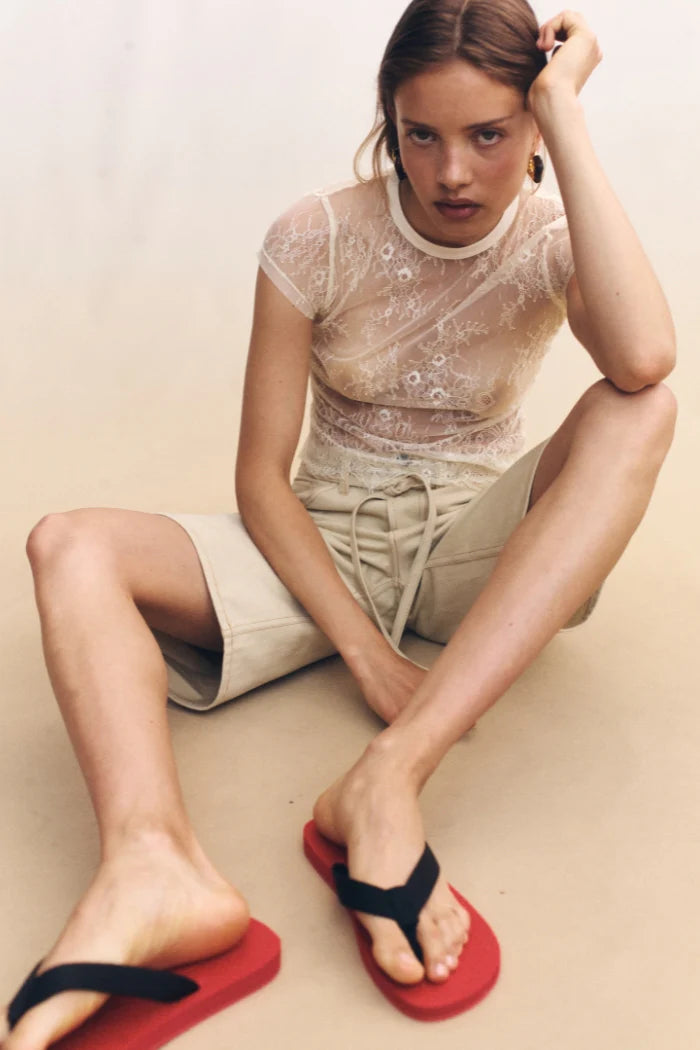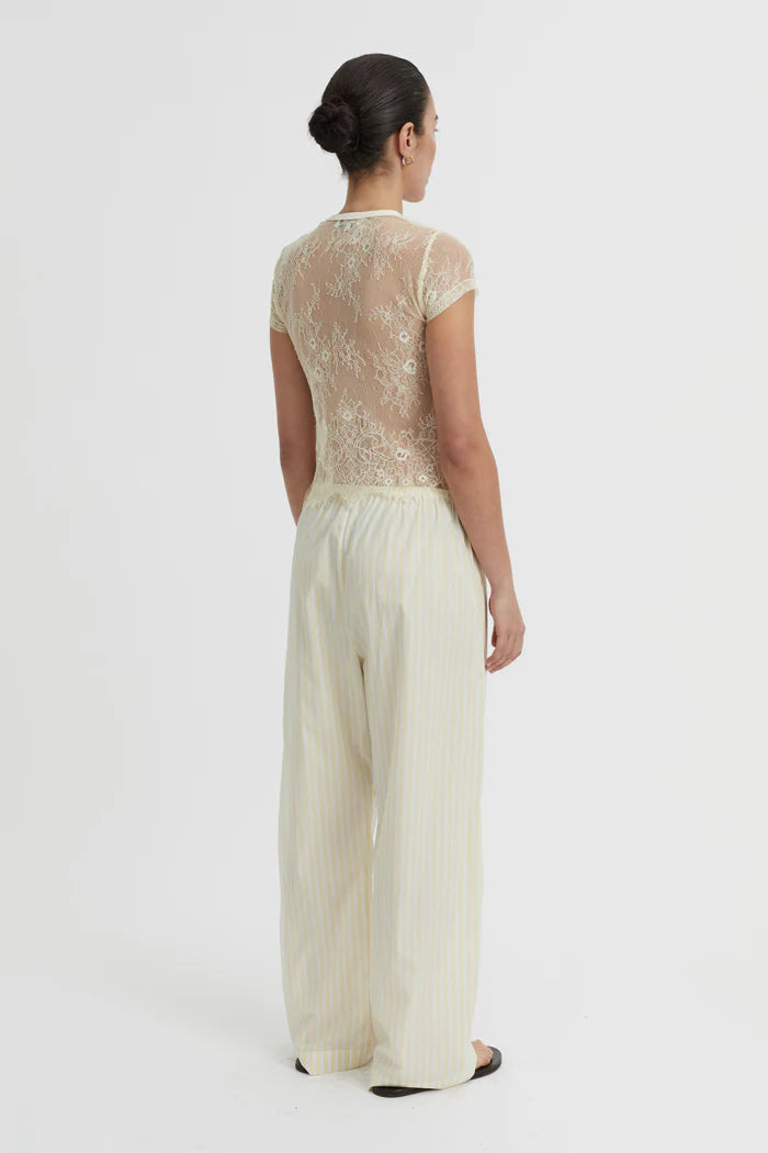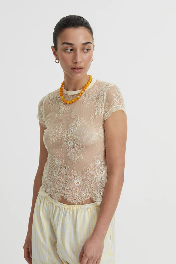 A sheer rendition of a classic shape, the Riven Baby Tee reimagines femininity through the lens of simplicity. Cut from fine ivory lace, it features a soft crew neckline and close-fitting short sleeves, echoing vintage minimalism with modern intention. Its delicate floral motif adds quiet texture to an otherwise clean silhouette.