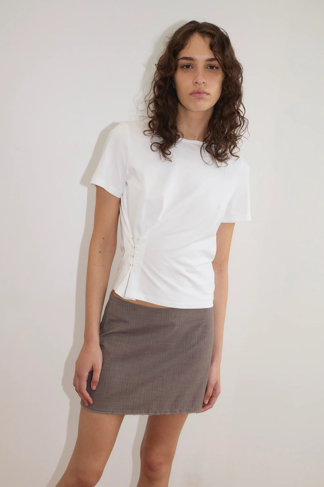 a relaxed short sleeve tee with a classic crew neckline shape finished with loose elastic and straight cut body, featuring a pinched side seam with hook and eye closures that allow the shape to be worn cinched in or left open