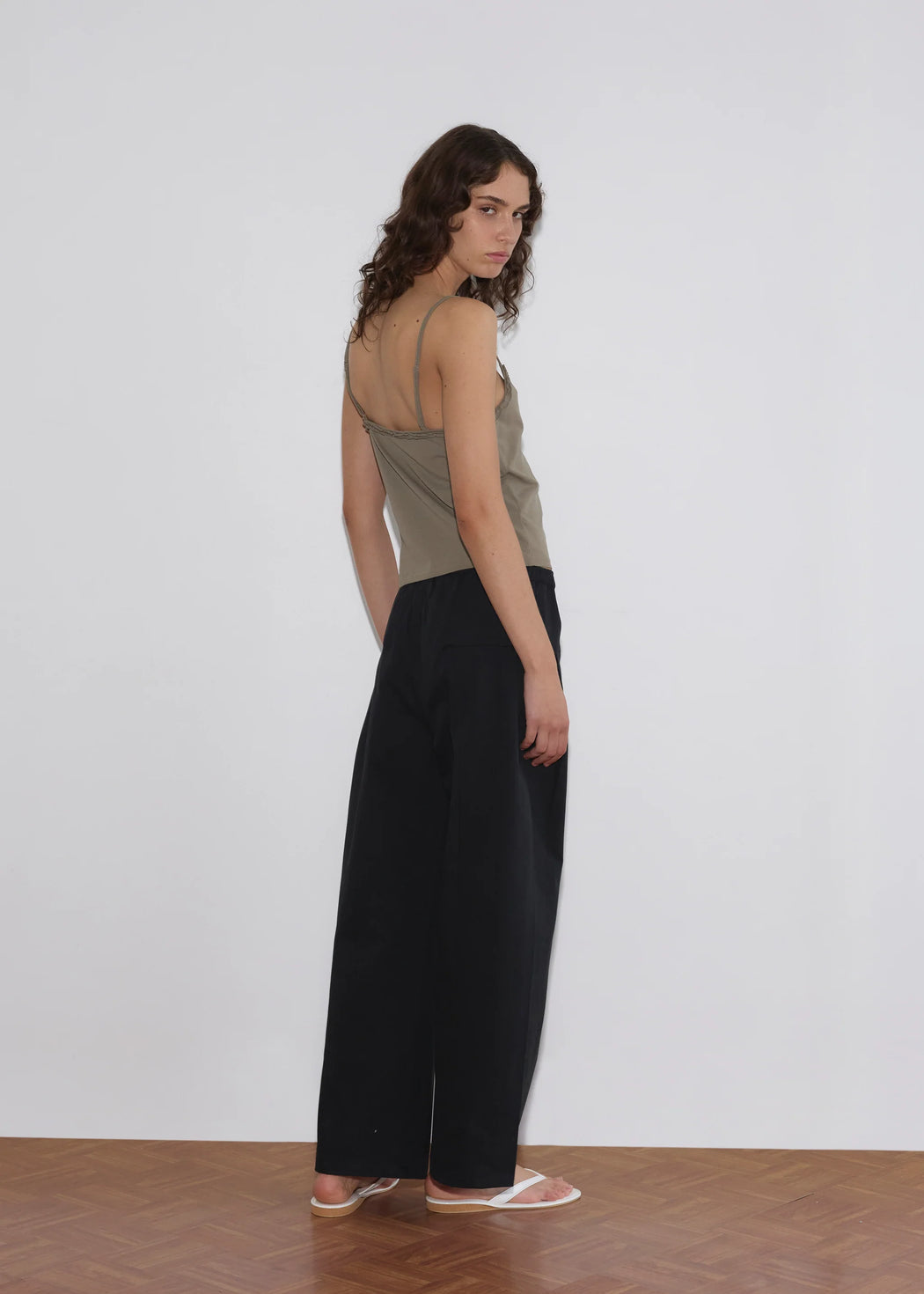 a relaxed, straight leg pant designed to sit low-mid rise with a soft elasticated waistband and subtle front and back pleat detailing. features front pockets with zips and back pocket. finished with a full-length silhouette and an easy, comfortable fit through the leg