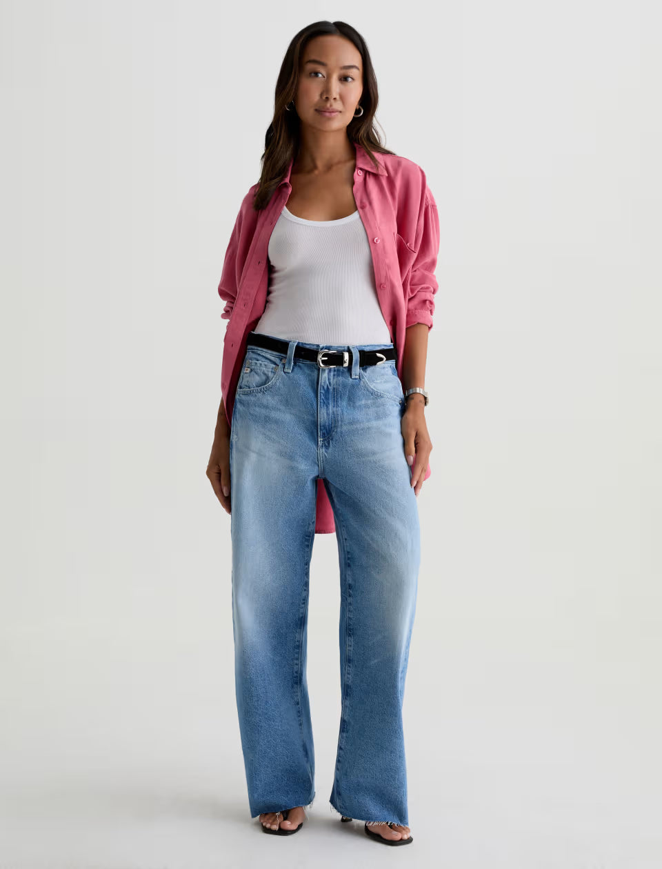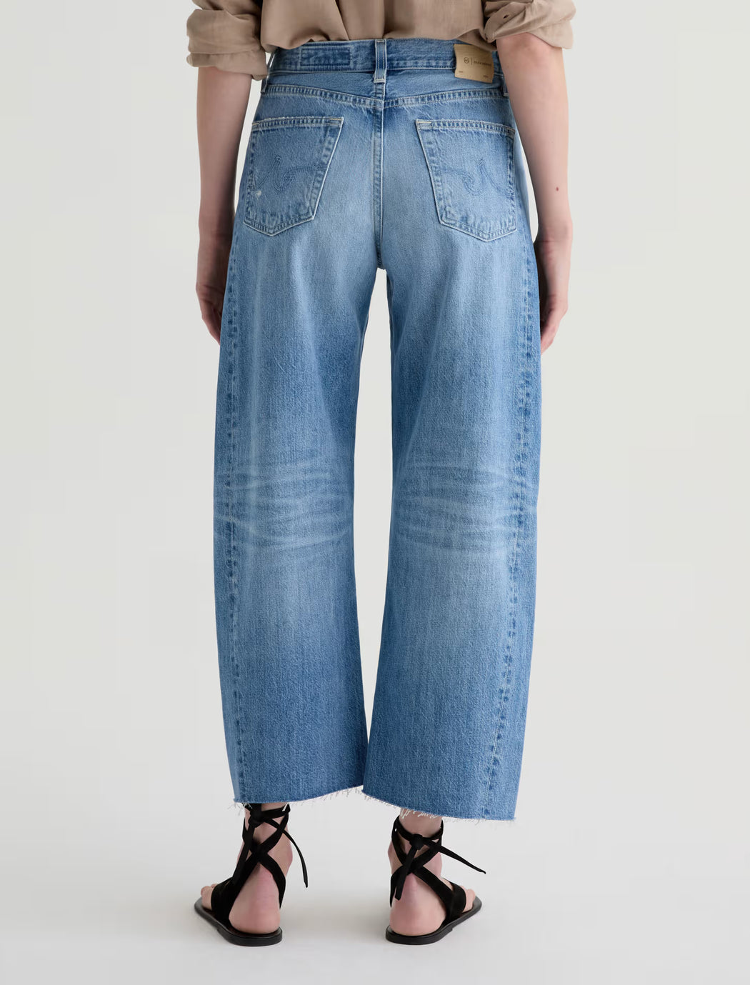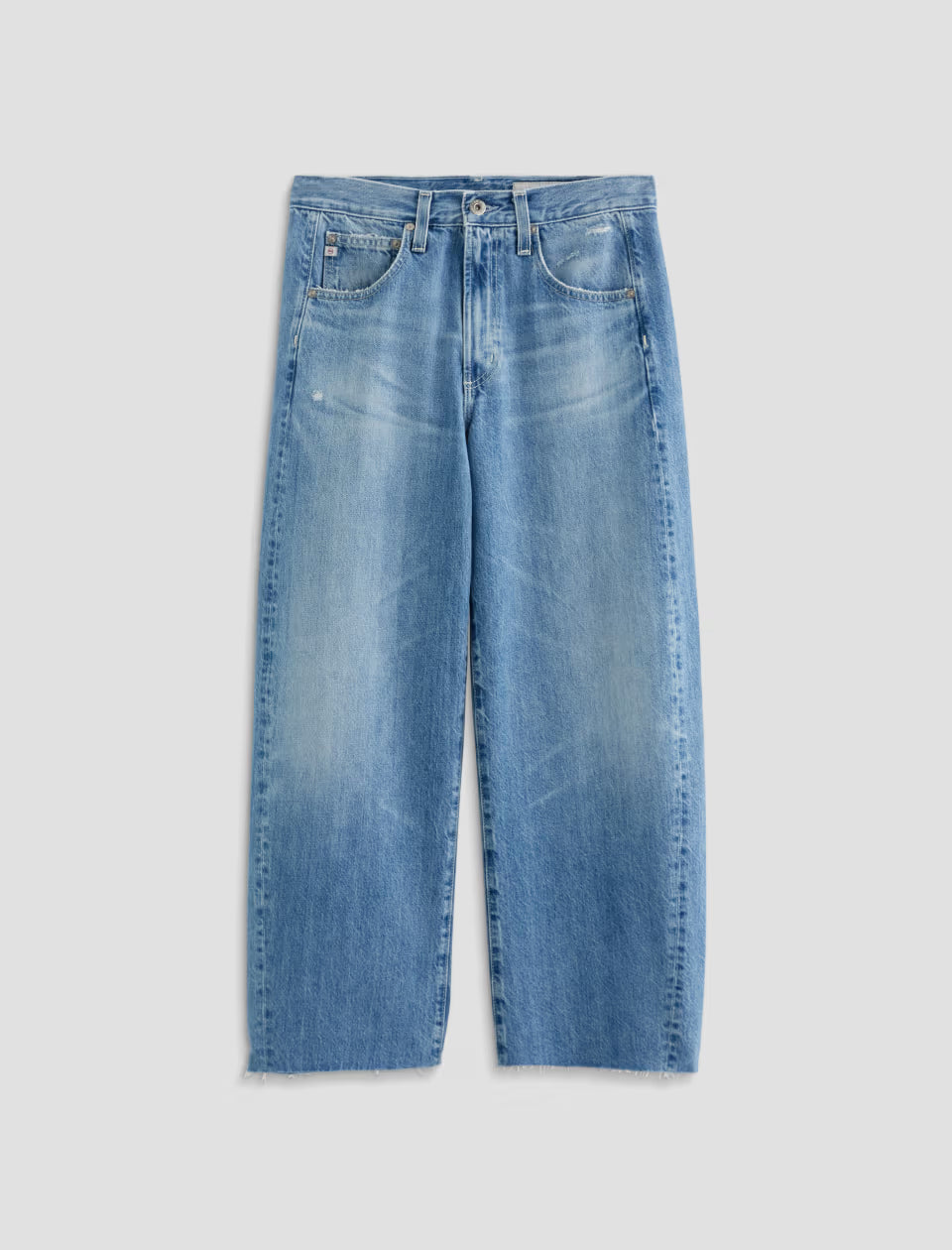 The Hattie Crop is a high-rise barrel made from non-stretch denim. In an AG-ed™ light wash to resemble 17 years of authentic wear, it is designed with raw hems, and offers a structured shape with a casual, lived-in finish.