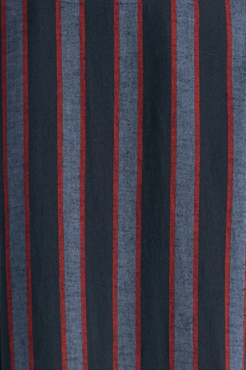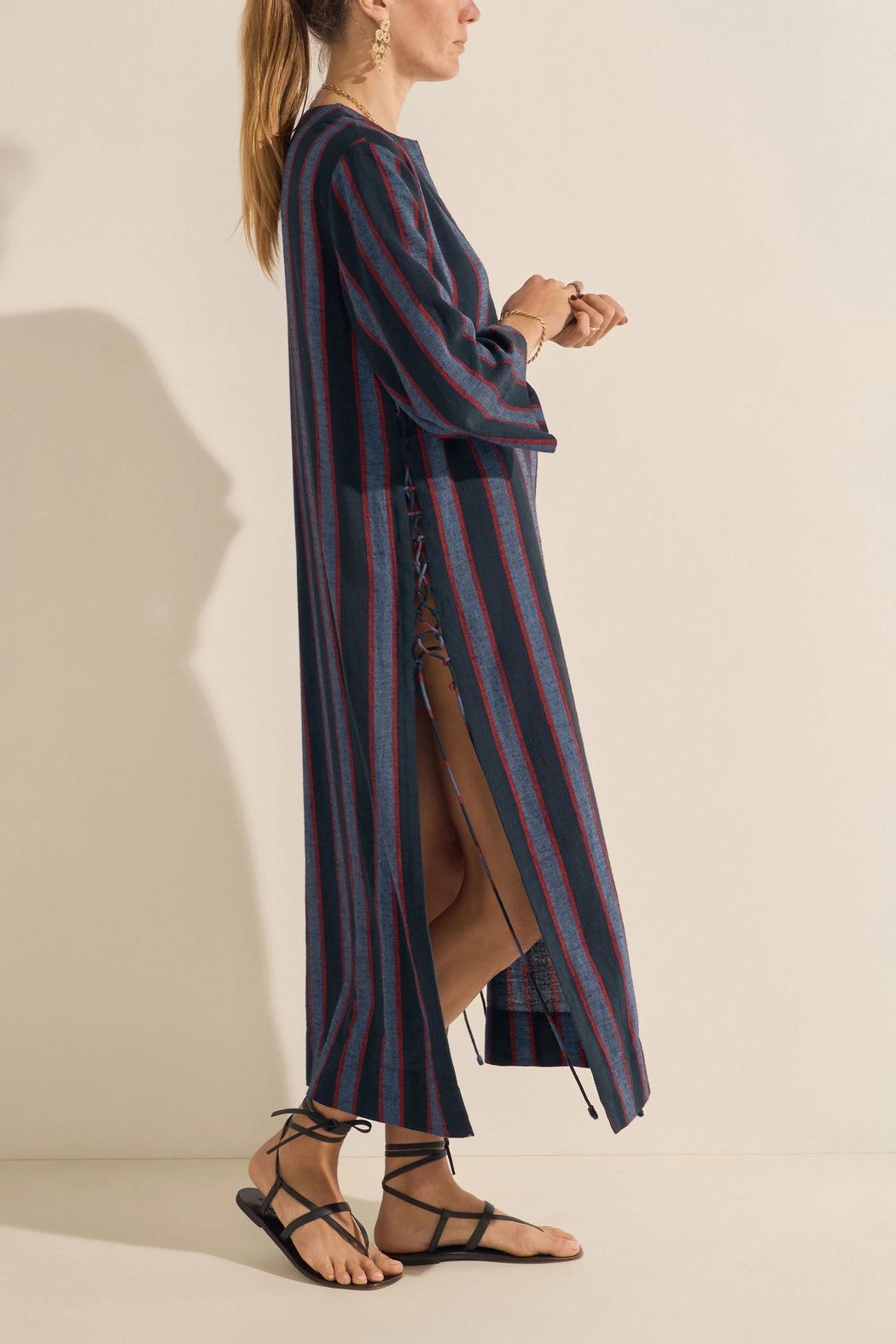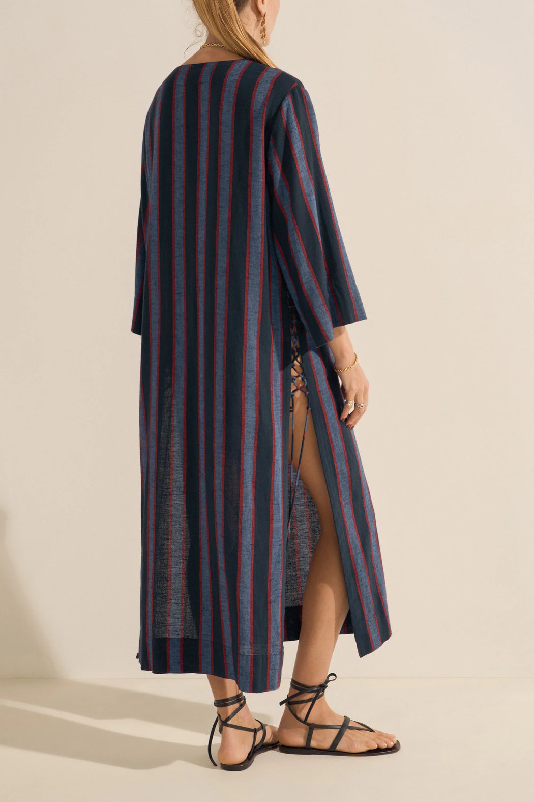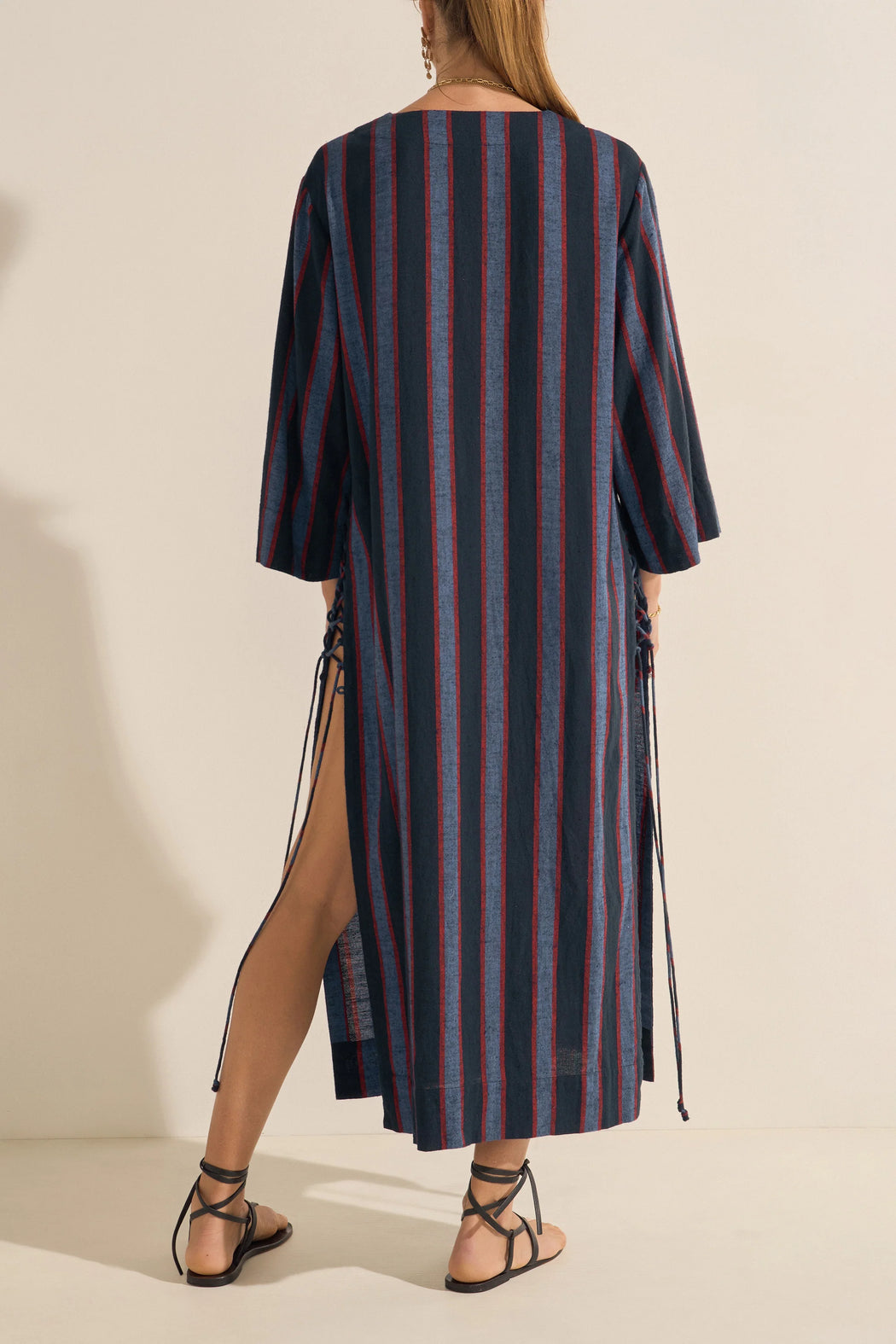 The Sunion Caftan in a dark cotton stripe with pops of royal blue and red is a bold yet elegant piece. Featuring peek-a-boo side lacing, this long, flowy caftan covers the body while the deep V neckline and side lacing add a sexy touch. Perfect for an après-surf look or also great layered over jeans. Elevated and timeless, it’s a feminine piece to cherish for years to come.