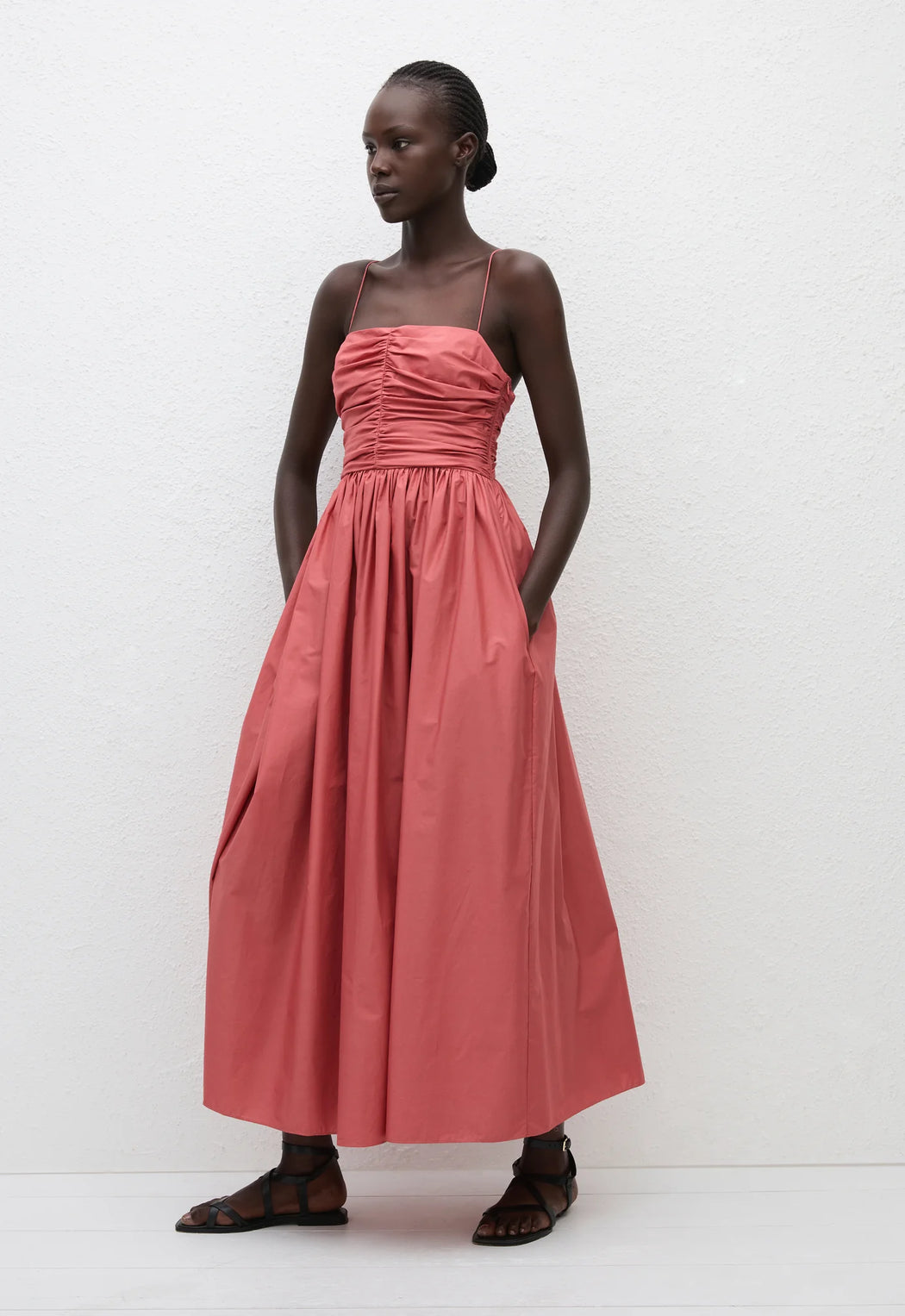 This midi dress is a playful twist on a classic silhouette, featuring a sweetheart neckline, fine straps and a gathered bodice which extends into a full gathered skirt with concealed pockets. Perfect for celebrations or long lunches under the sun.