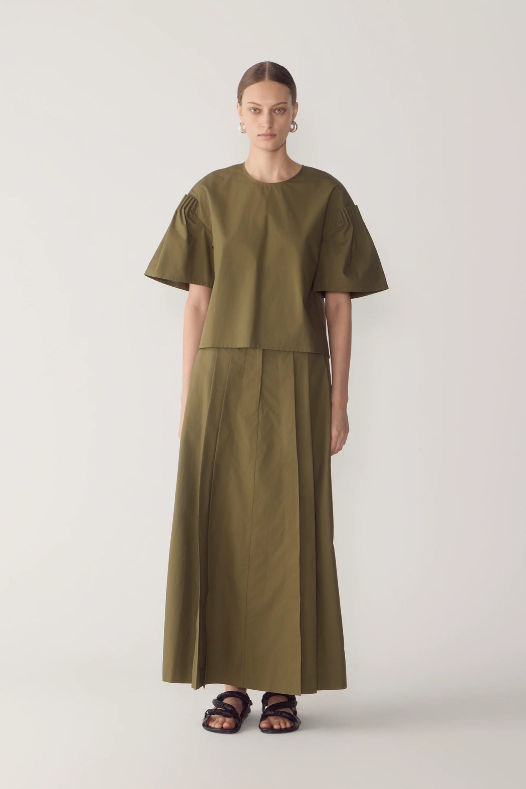 This top is defined by clarity of line and a singular sculptural gesture. Crafted from smooth cotton tencel, it features a clean round neckline and a concealed zip at the back, allowing the silhouette to fall straight and uninterrupted through the body. The dramatic bell sleeves form the centrepiece of the design, structured with precise pintuck detailing at the shoulder to create controlled volume and a strong architectural profile.