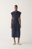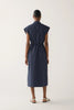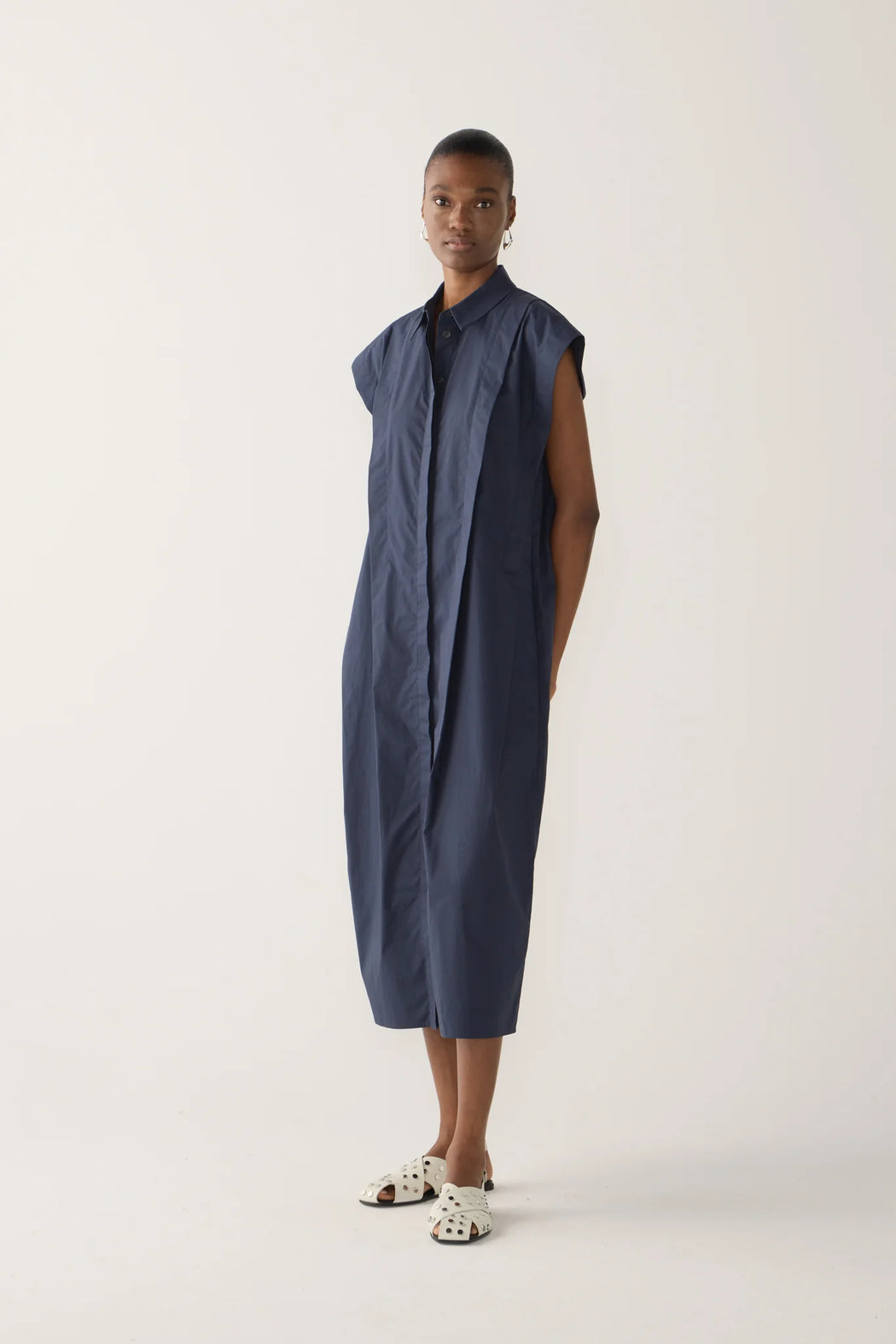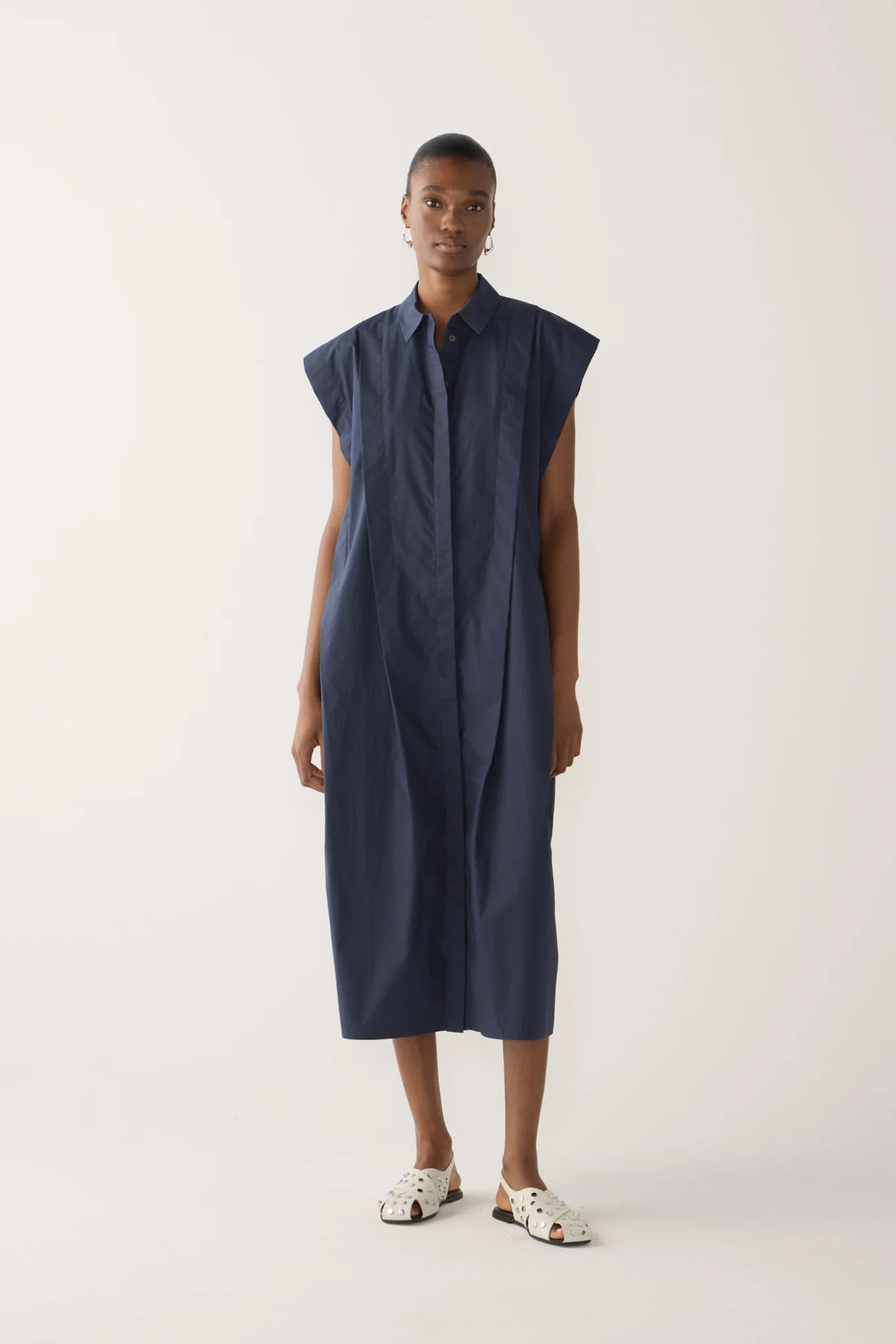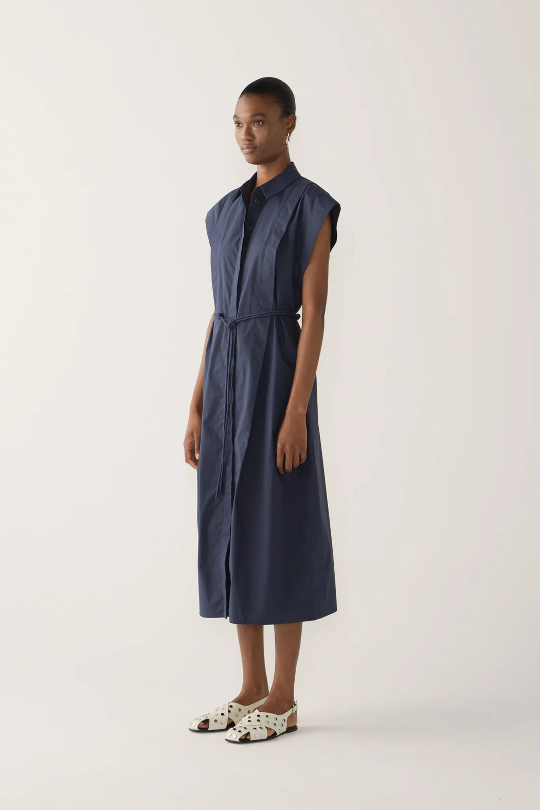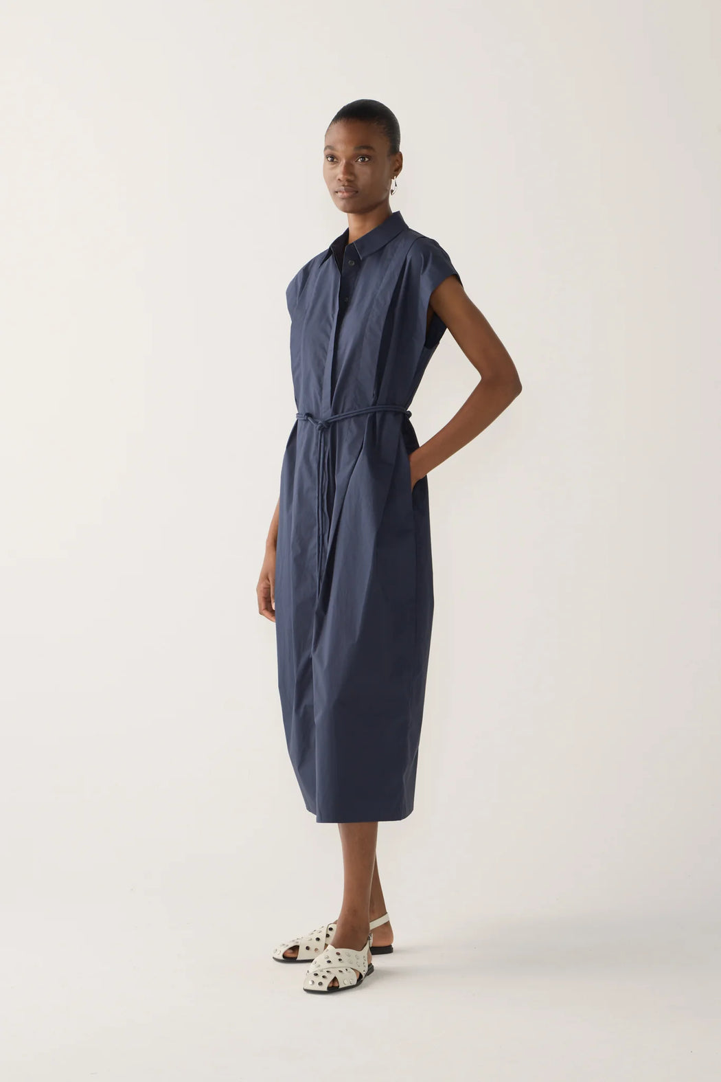 An elevated take on the shirt dress, this style is defined by its clean lines and subtle detailing. Cut to a midi length in a crisp blue pinstripe, it features a concealed placket for a streamlined finish. Pleats fall softly from the shoulder, opening into the skirt to create gentle volume and movement. A knotted rouleau belt cinches the waist, offering shape while maintaining an effortless feel.