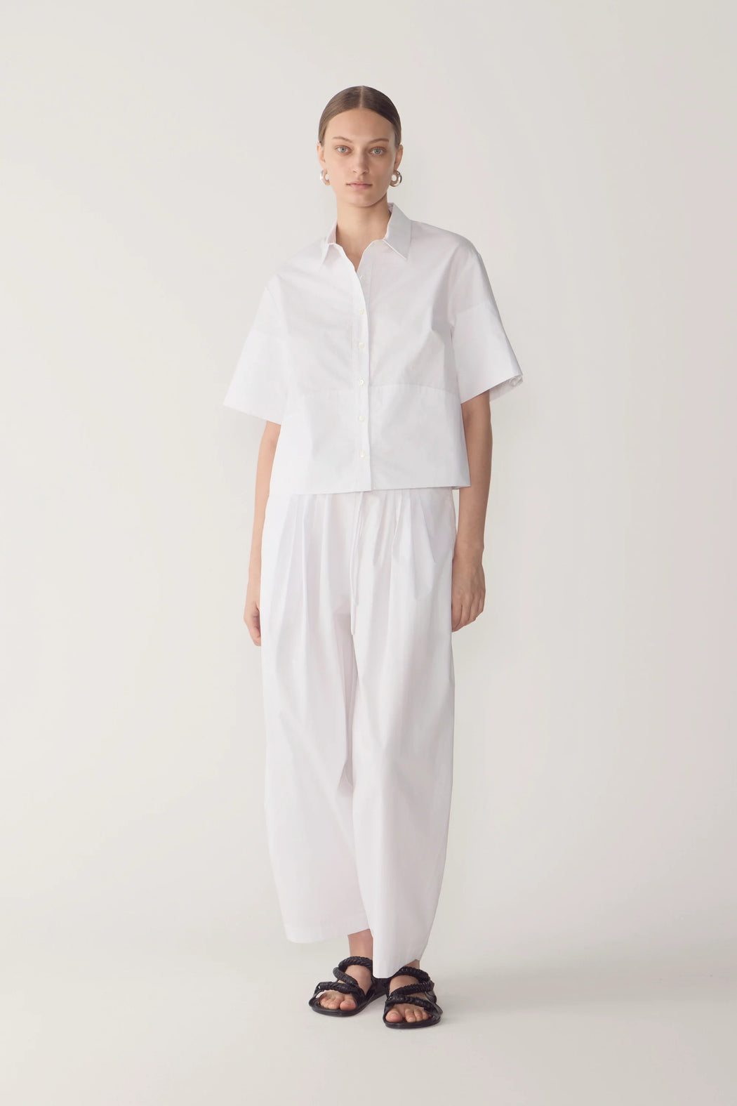 This shirt refines everyday tailoring through clean lines and considered construction. Crafted from organic cotton poplin, it features a classic collar with an exposed button placket that anchors the design with understated structure. The short sleeves are finished with a wide cuff and precise box pleat detailing, creating a subtle architectural accent at the arm. The hem, with curved seam detailing and double-layered finish, adds depth and durability, balancing softness with definition. An effortless piece designed for modern dressing, where practicality meets quiet sophistication.