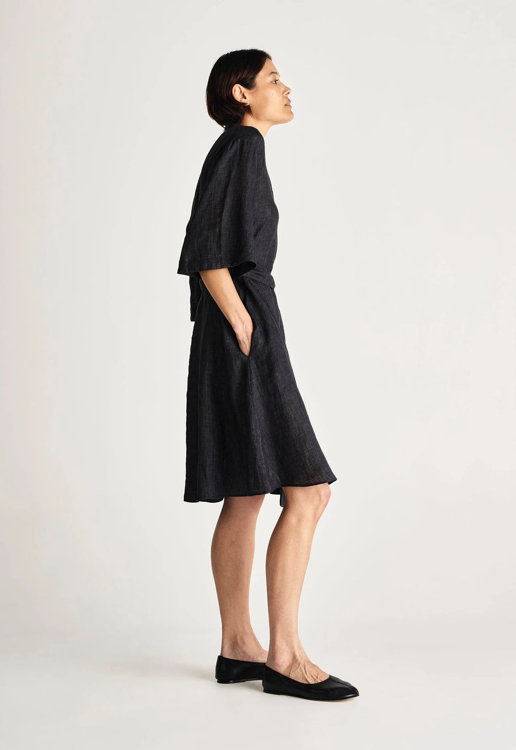 The Esther Dress is a vision of a button up dress focused on clean design with just the right amount of detail.  Featuring a subtly detailed v neckline continuing down a covered central placket to the hem. A full flared elbow length sleeve and flared skirt enhance the natural beauty and drape of the linen fabric. The flattering design lines at the waist mean it can be worn without the seperate belt for a casual occasion and with the belt for a dressier look.