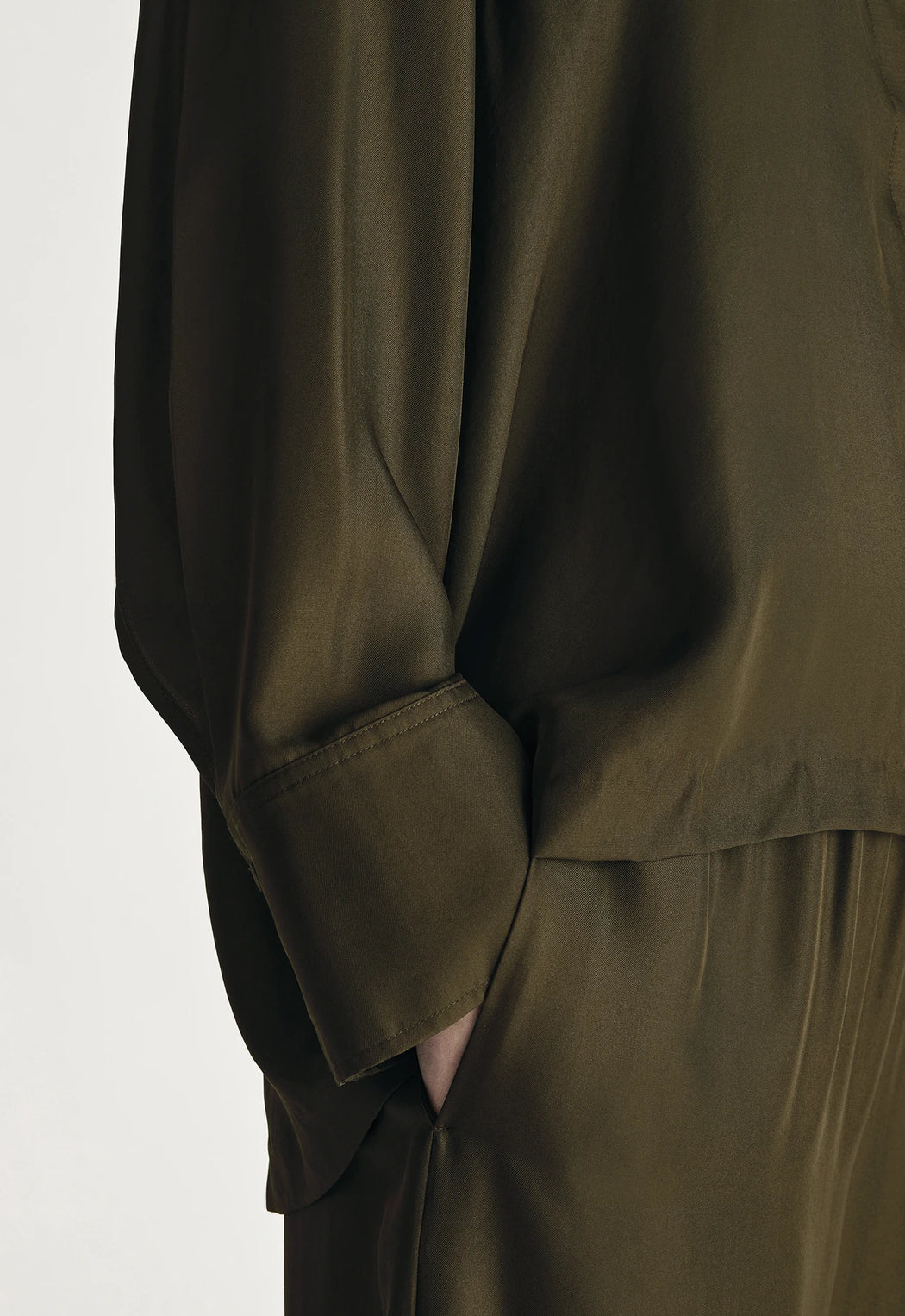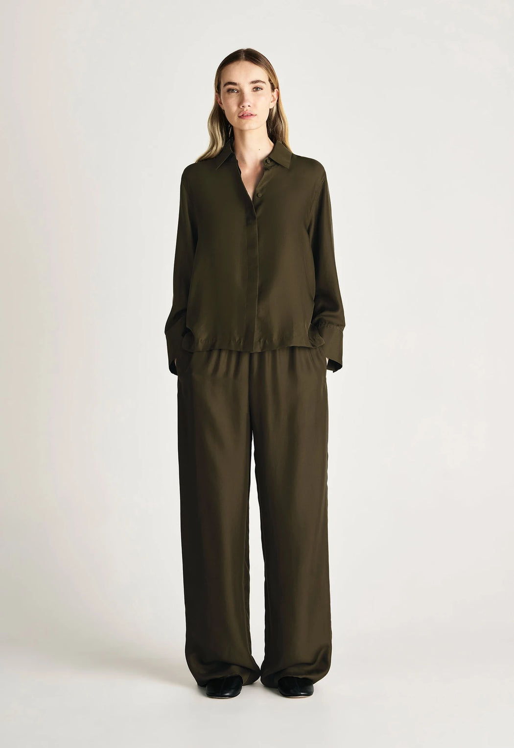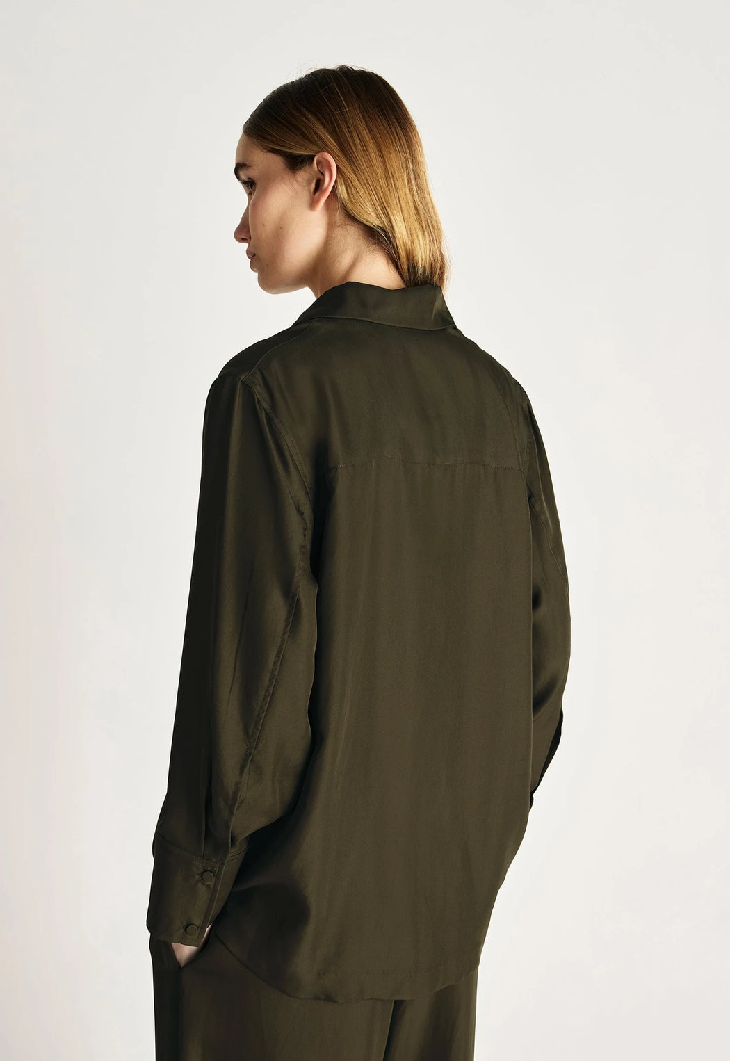 The Linc Silk Shirt is a refined wardrobe essential, crafted from lustrous silk twill that showcases the natural sheen and fludity of the fabric. With a slightly oversized fit, elongated back and intentionally minimal detailing, this shirt drapes effortlessly while maintaining a sense of modern elegance. Features such as the high-low with rolled hem and concealed placket with covered buttons highlight subtle tailoring while allowing the silk to remain the focal point, making it a verstaile piece for both day and night.