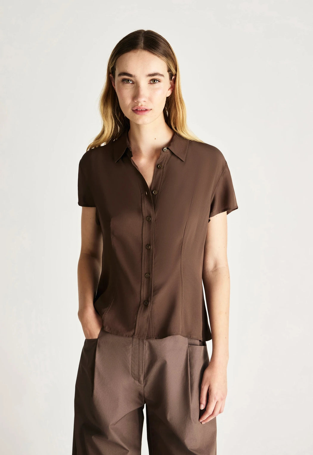 The Peta Blouse is a softly tailored, feminine style crafted from lightweight viscose georgette. Designed with a fitted shape and cap sleeves, this button-up blouse features carefully placed darting through the front and back to create subtle definition while maintaining an elegant, fluid feel. Refined yet practical, the Peta Blouse balances softness with structure, offering a light, airy finish with a touch of sheerness.