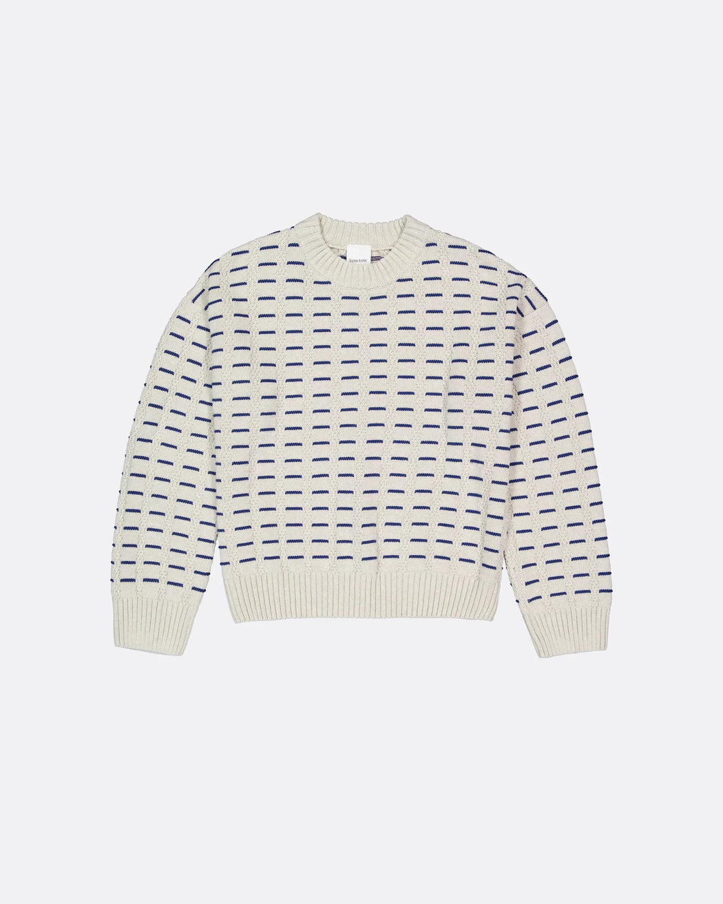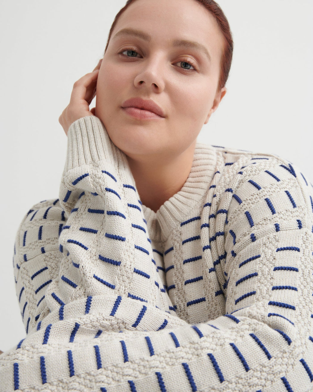 A boxy knit with a slight drop shoulder and thick ribbing at the neck, cuffs and hem. Crafted in organic cotton, the Thread Jumper features a subtle blue accent stripe and vertical textured knit. A soft, relaxed layer in a natural Oat Melange.