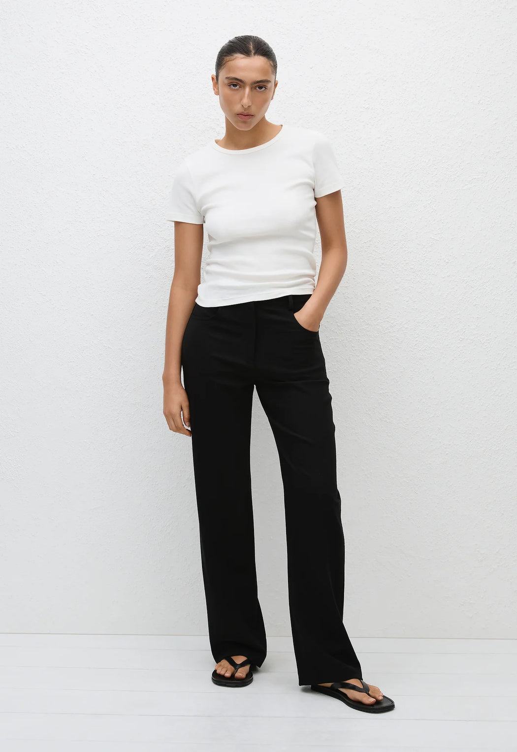 An everyday baby tee featuring a crew neck and flattering short sleeves. Made from 100% cotton, this tee features a self bound detail around the neck, and a coverstitch hem finish on the sleeve and body. Wear tucked in with our Long Chino Short or Relaxed Jean and pull together with our Boyfriend Belt.