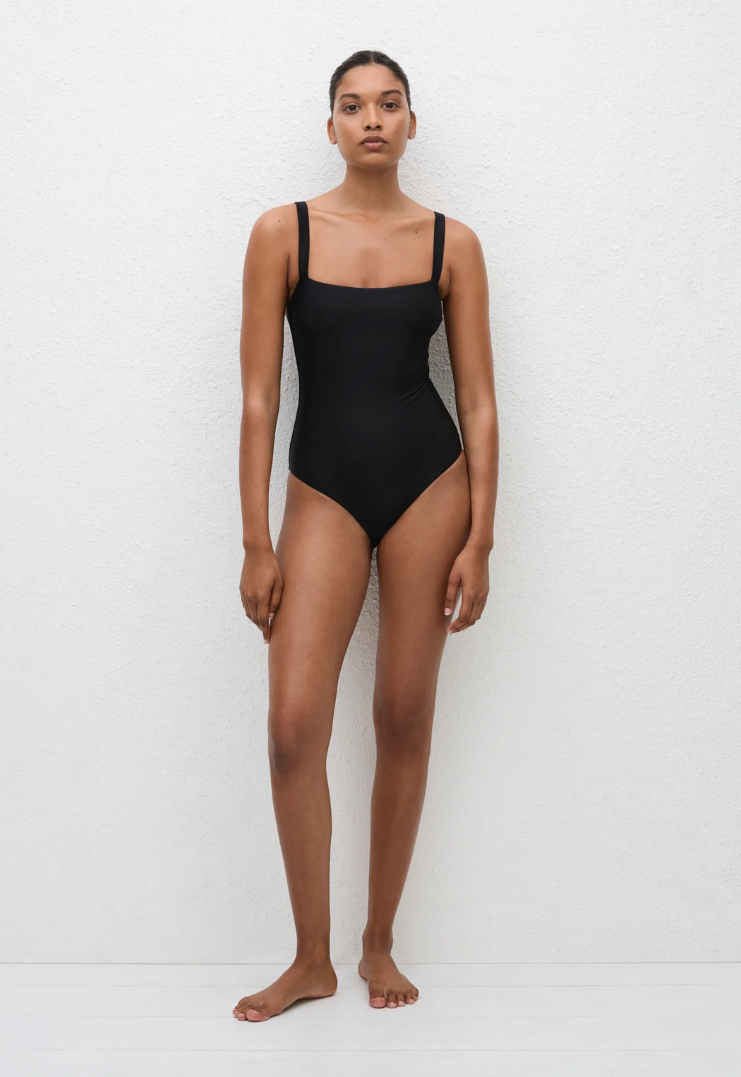 A maillot with a wide straps and a vintage-inspired square bustline. Flattering on all bust sizes and can accomodate from A to D cup. This suit has a mid to high-rise back and offers medium rear coverage. Fully lined and made from recycled nylon and elastane, with seamless front finishing.