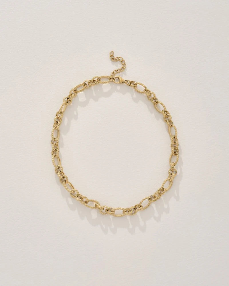 It's all gold, gold, gold, glitz and glamour in the Zion Necklace. Jewellery becomes the centrepiece with this waterproof gold necklace, featuring varied chain links, textured for extra-ornate, glamorous effect. She's fit for the Golden Era screen queen, the ready-for-anything Euro summer babe and all desk-to-dancefloor situations. Steal the show and own the night. Includes a lobster clasp.