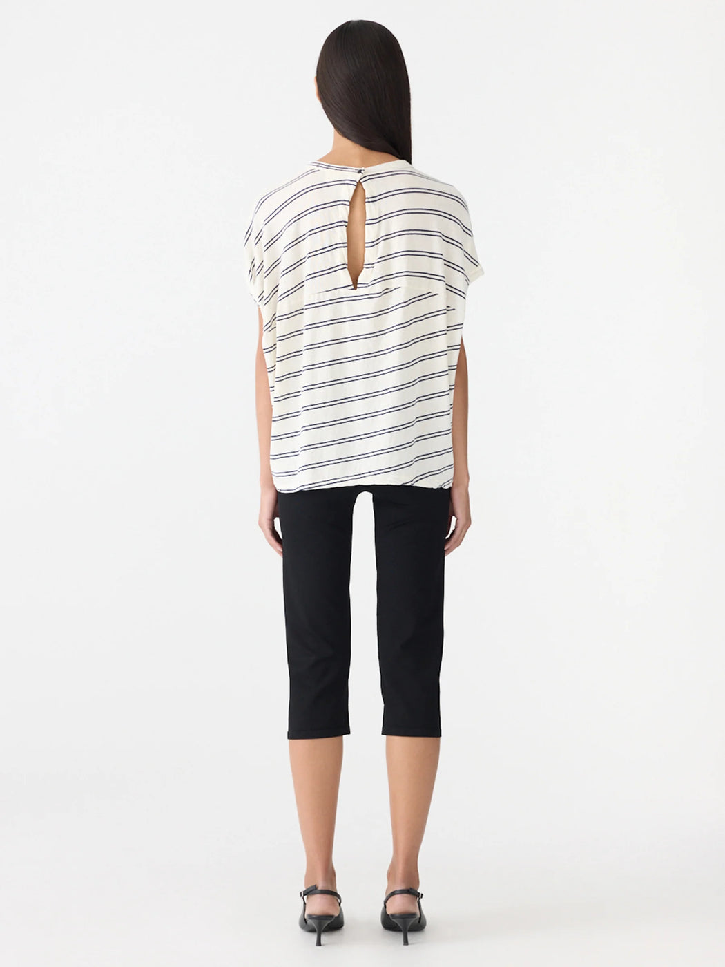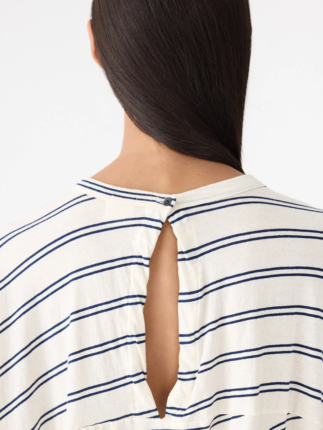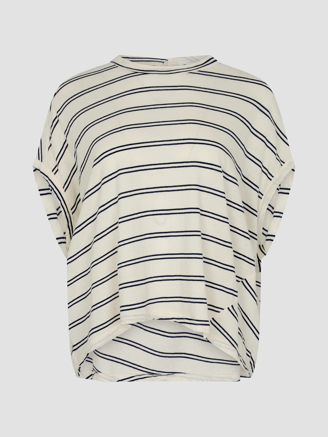 The Stripe Circle T-Shirt is a foundational wardrobe element relaxed by a subtle rounded silhouette. This redefined stripe relaxed tank boasts a curved hem detail and elongated capped sleeves. Refined by an open back detail with button closure. Complete with twisted side seams, oversized armholes and a heritage neck with bind.