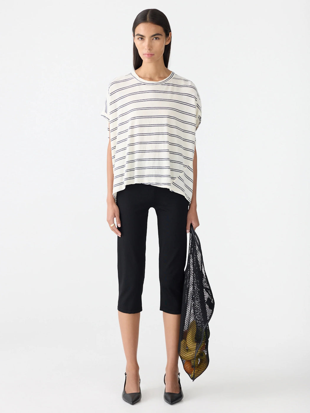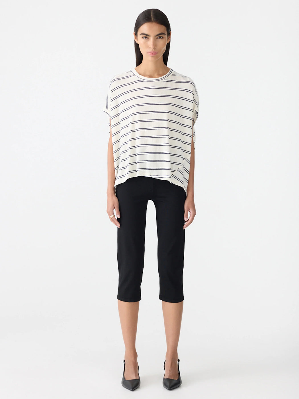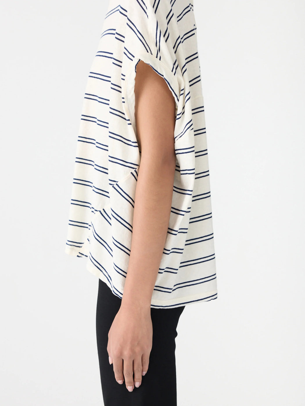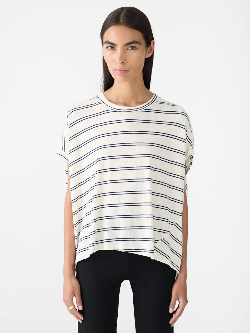 The Stripe Circle T-Shirt is a foundational wardrobe element relaxed by a subtle rounded silhouette. This redefined stripe relaxed tank boasts a curved hem detail and elongated capped sleeves. Refined by an open back detail with button closure. Complete with twisted side seams, oversized armholes and a heritage neck with bind.