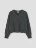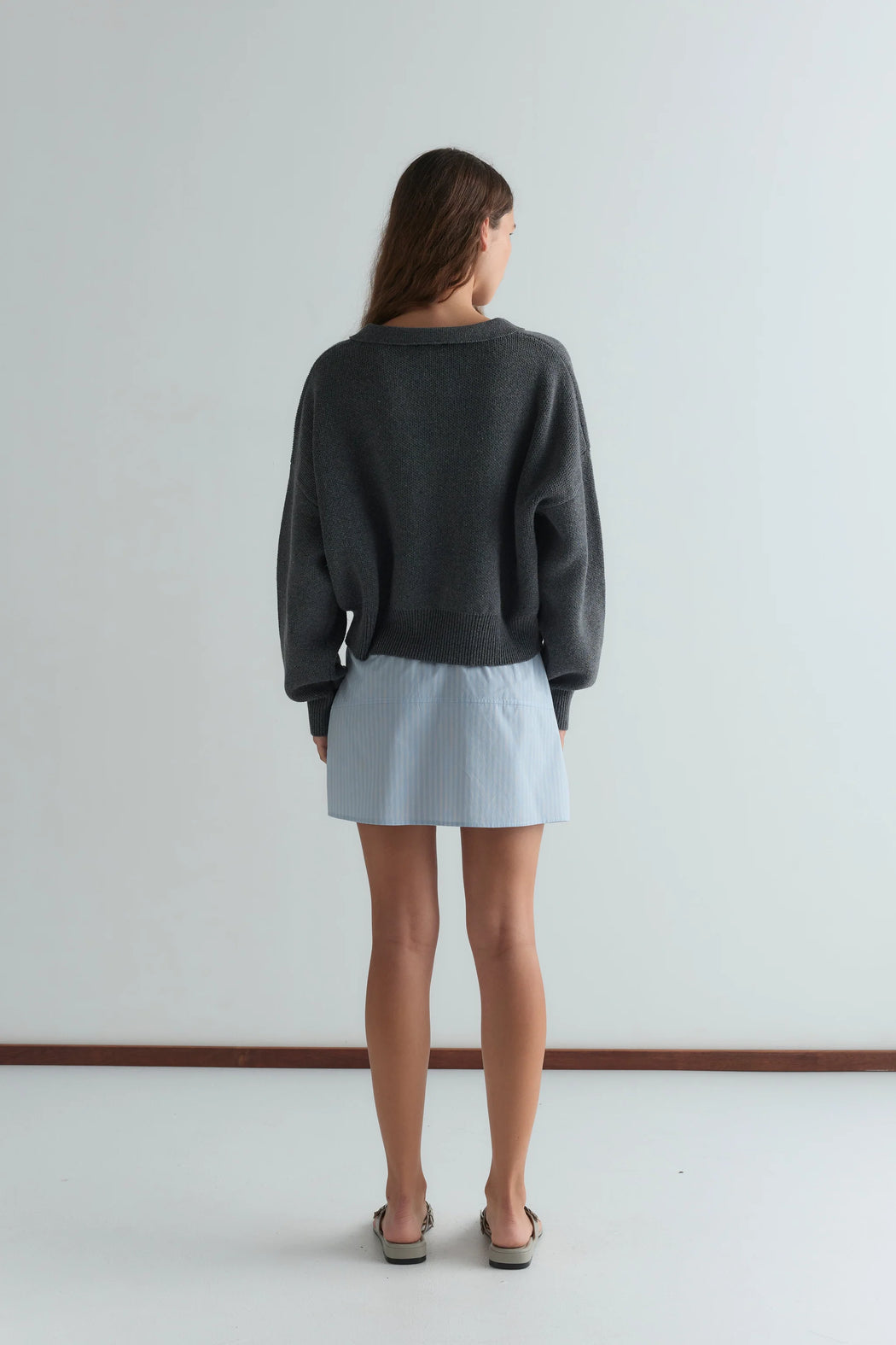a relaxed long-sleeve knit featuring a soft open collar with rib neckline detail, silver eyelet detail, dropped shoulders, and ribbed cuffs and hem. designed for everyday layering in a slouch fit