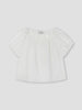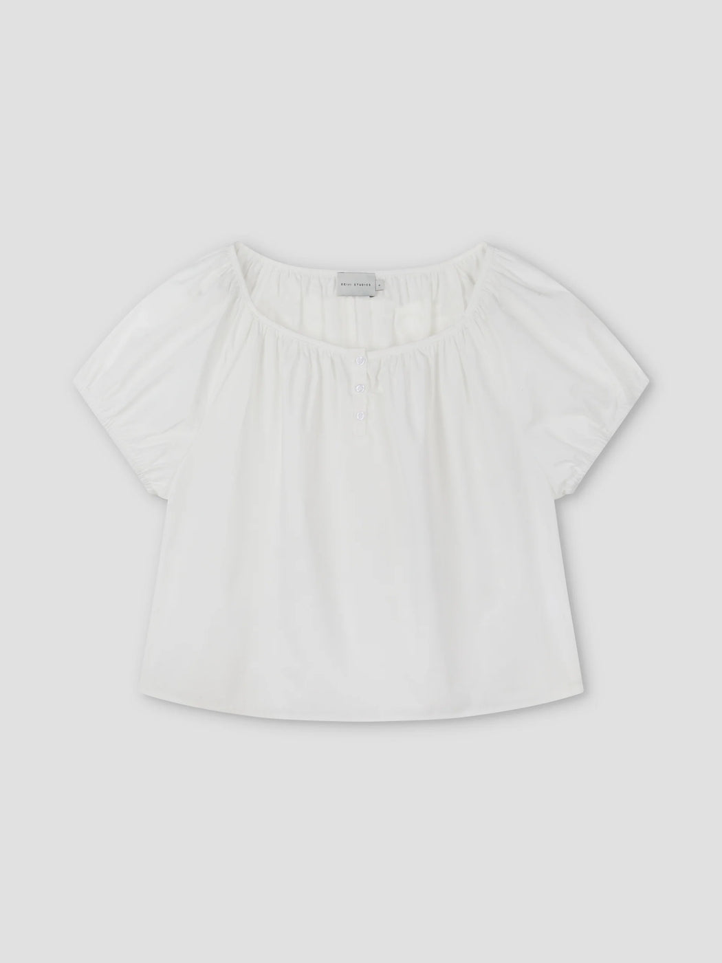 a softly structured short sleeve shirt featuring a rounded neckline with a button opening at centre front. designed with gently puffed sleeves, elasticated cuffs and a cropped, relaxed silhouette with a straight hem