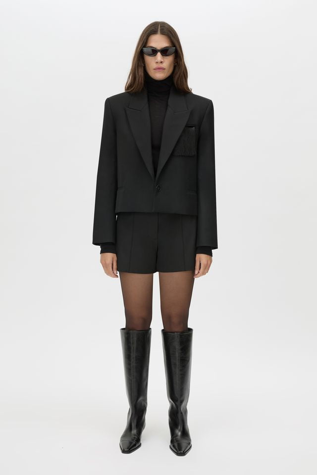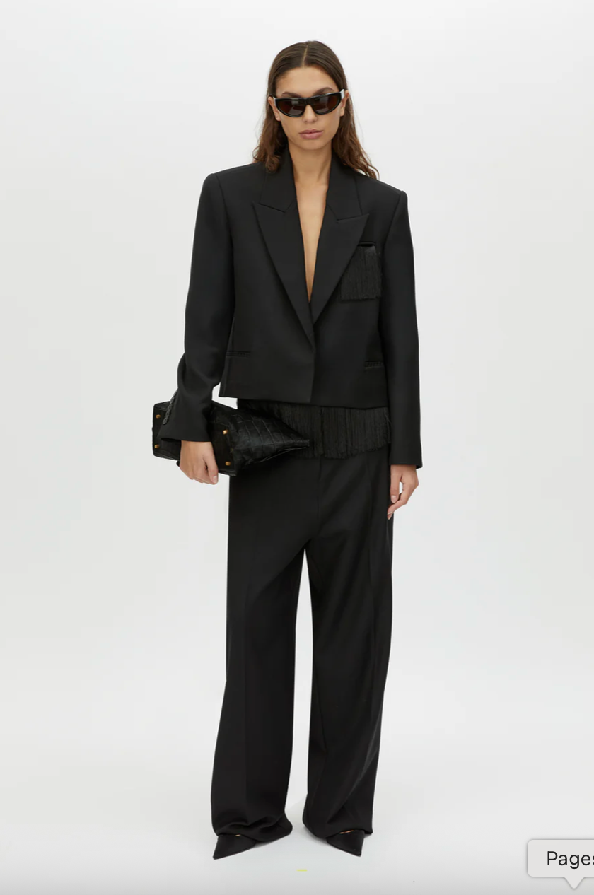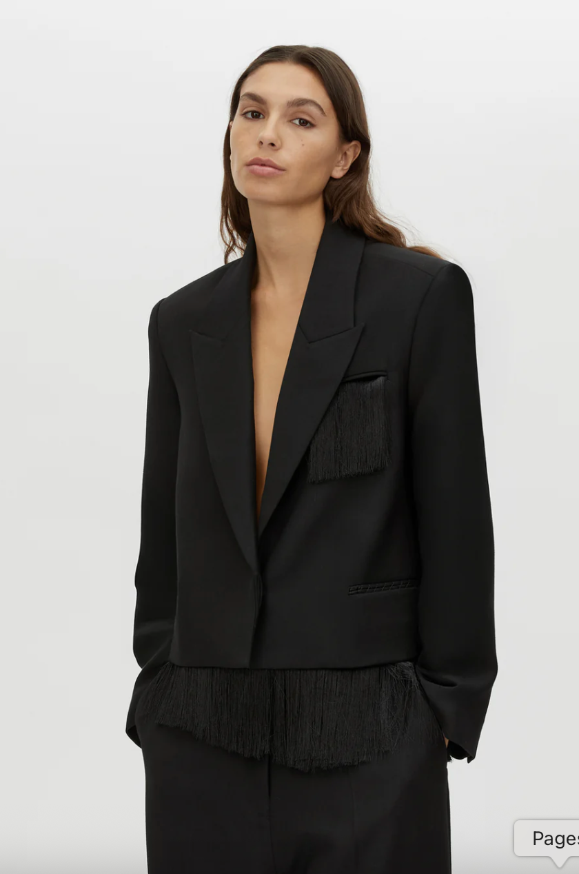 CAMILLA AND MARC Zaman single breasted black blazer with fringe detail. Concealed centre front button closure. Chest jet pocket with fringing.