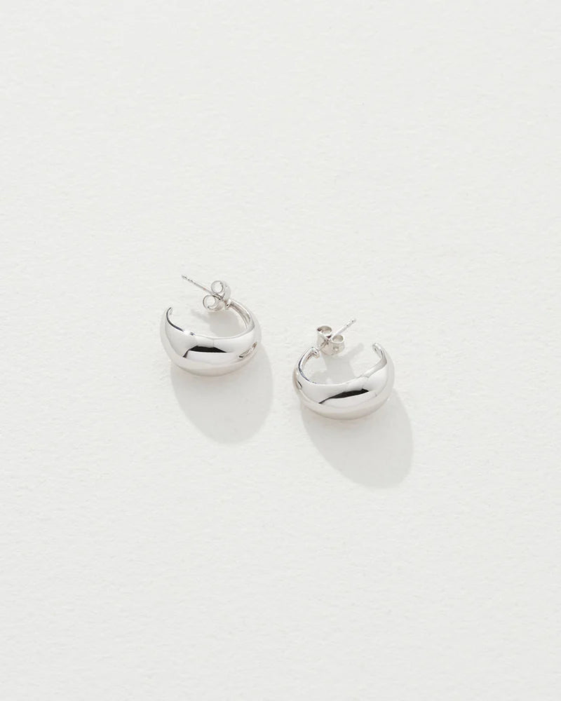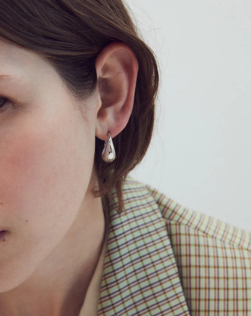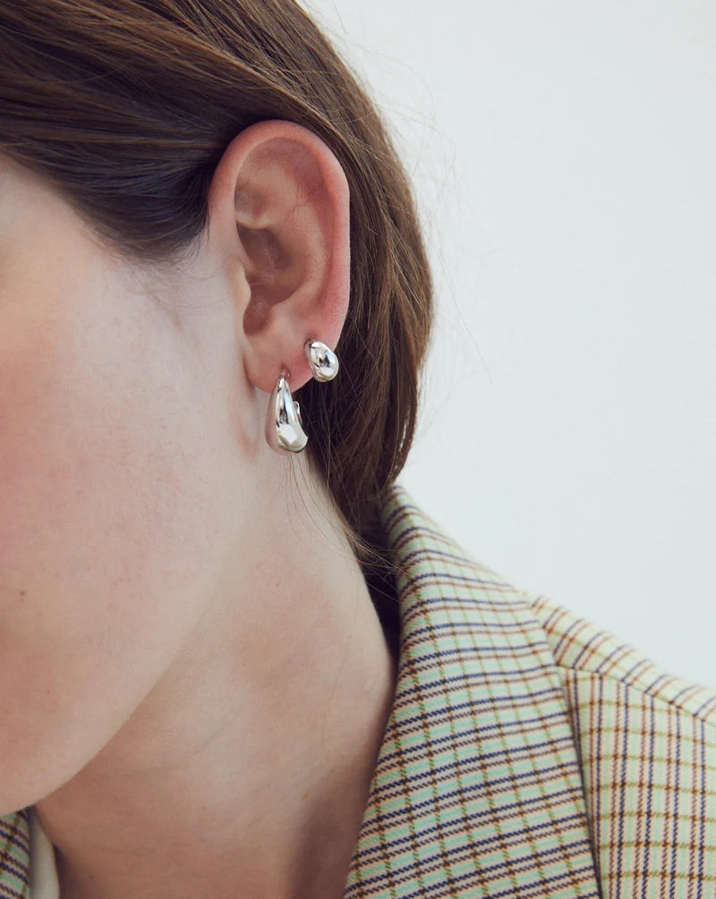 A bestseller reimagined in recycled silver, the Olivia Earrings make tonal mix-and-match a statement possibility. Curved and fluid like a Renaissance sculpture, her teardrop shape hangs from the ear before flicking at the tip – a treat only visible from the side. Stagger this silver hoop with the smaller Mia Earring, or let the appeal of mixed metals reign, creating an ensemble that shouts your personality. Features a butterfly clasp.
