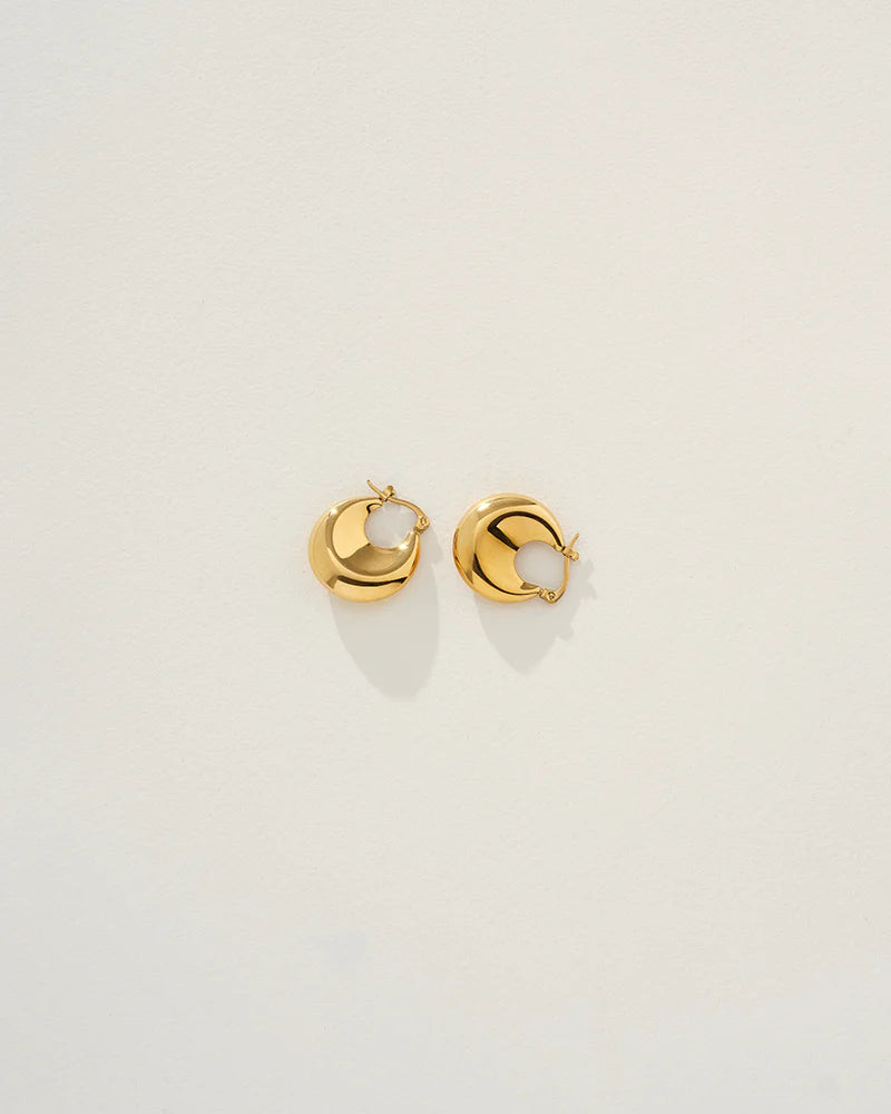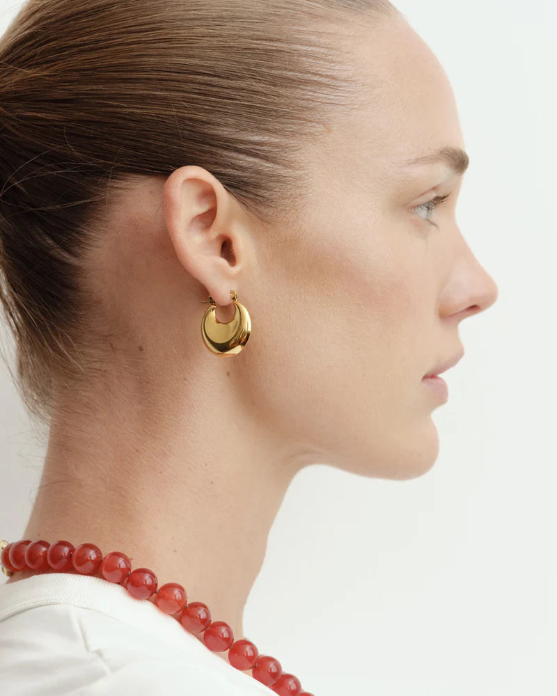 Sculptural and luminous, the Bara Hoops capture a timeless elegance with their bold, rounded form. Their golden surface catches the light effortlessly, creating a soft radiance that feels both modern and enduring. Designed for everyday wear, they bring a touch of quiet luxury to any look.
