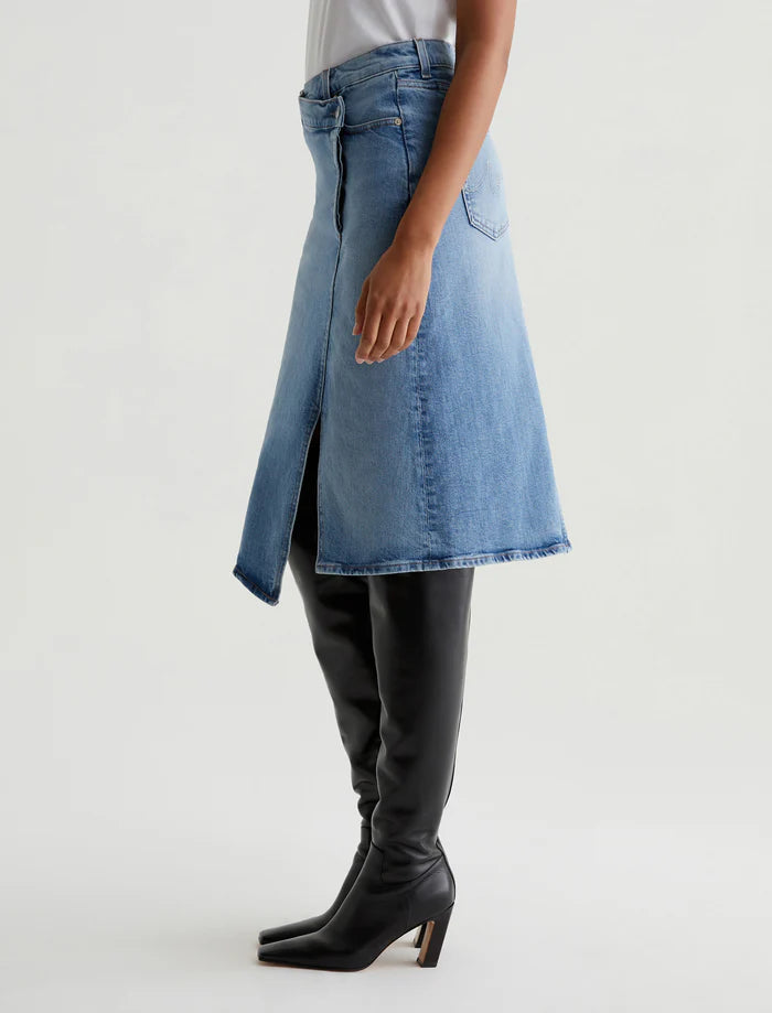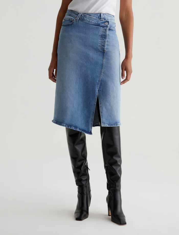 A twist on the classic wrap skirt. The Bruna denim midi skirt utilizes traditional five-pocket details in a deconstructed design with an asymmetrical wrap-front button-closure and an alluring front split. Made from 11.75 oz. Vintage Comfort Stretch Denim, the style comes in a light-blue wash with an allover AG-ed™ fade that emulates 18 years of wear. Finished with a godet at the back for added shape and room to move.