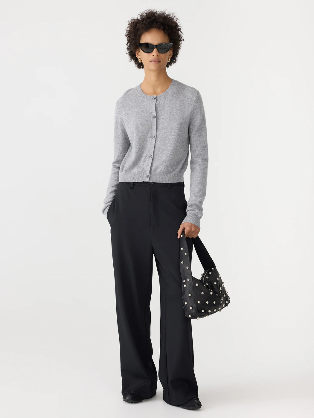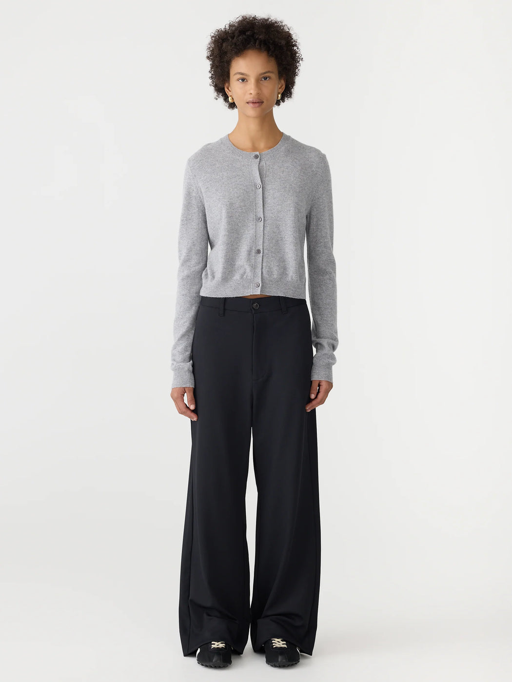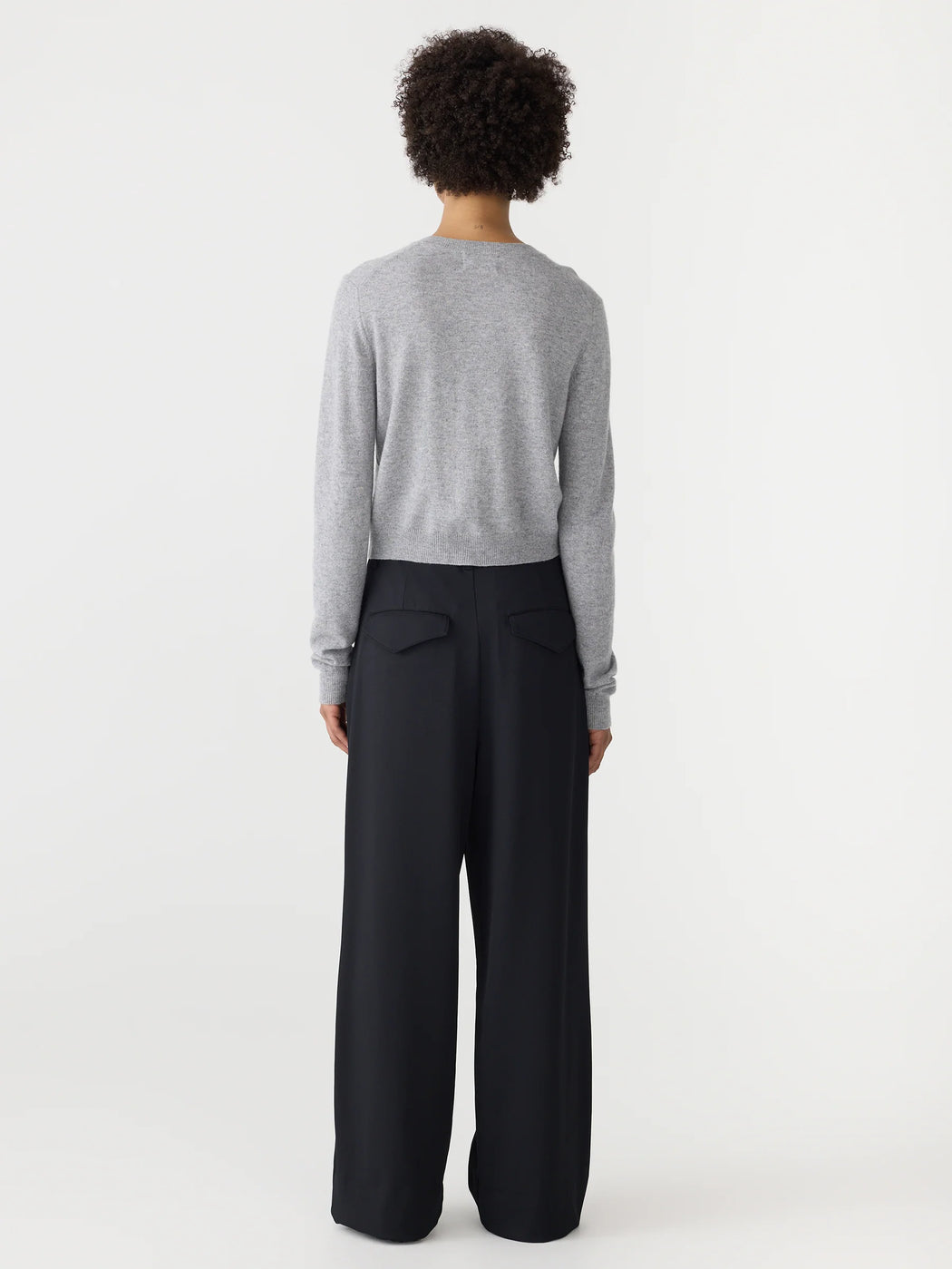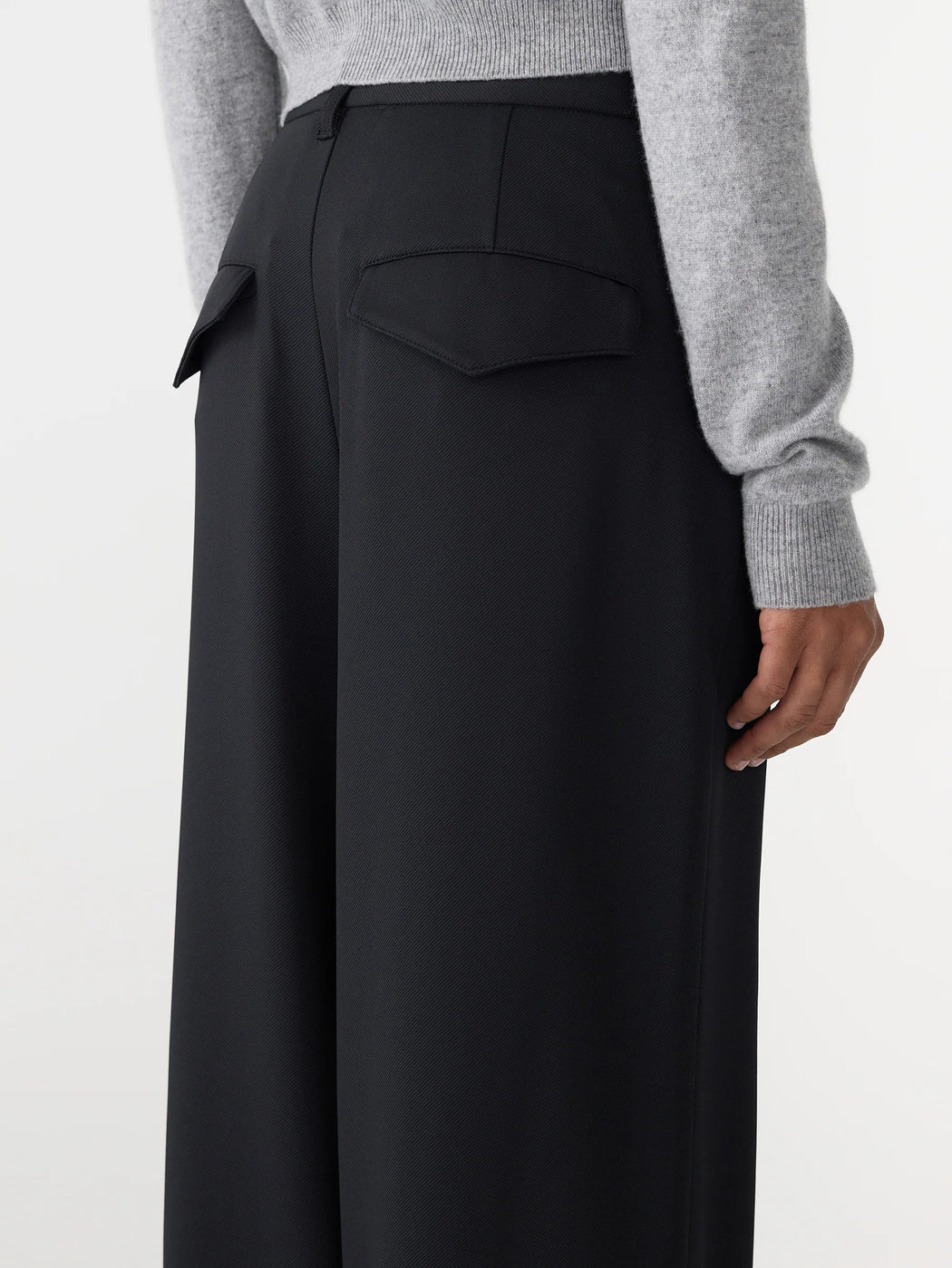 Crafted from bi-directional stretch twill woven from viscose and nylon yarns, the Stretch Twill Tailored Pant offers a subtle crepe-like texture with a comfortable stretch. Designed for a high-to-mid-rise fit, this style features a wide-leg, fluid silhouette. Finished with a fixed waistband, dark tortoise button closure, slant side pockets, and a back welt pocket with a pocket flap detail.