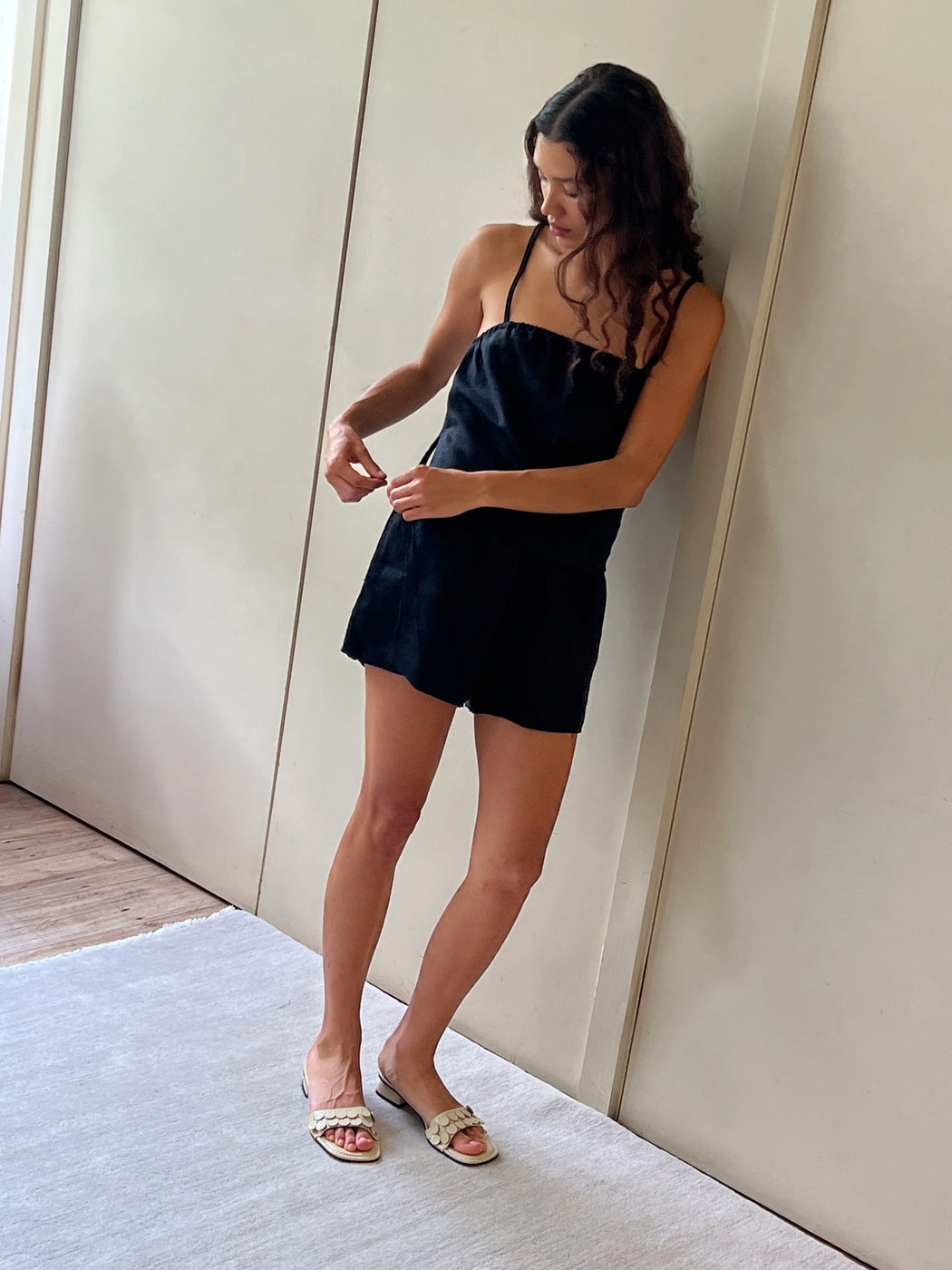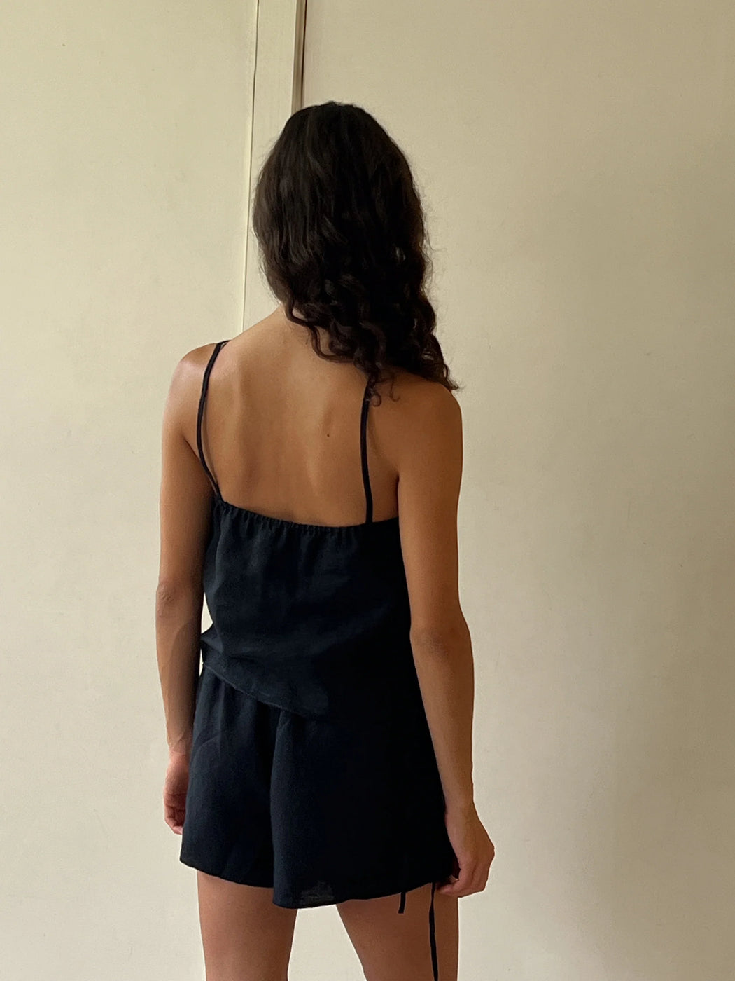 Relaxed top features a soft elastic square neckline, fine straps and self-fabric tie closure at side waist pairs back with an easy pull on short, featuring a soft elastic waist and side seam pockets to wear as a set or separately.