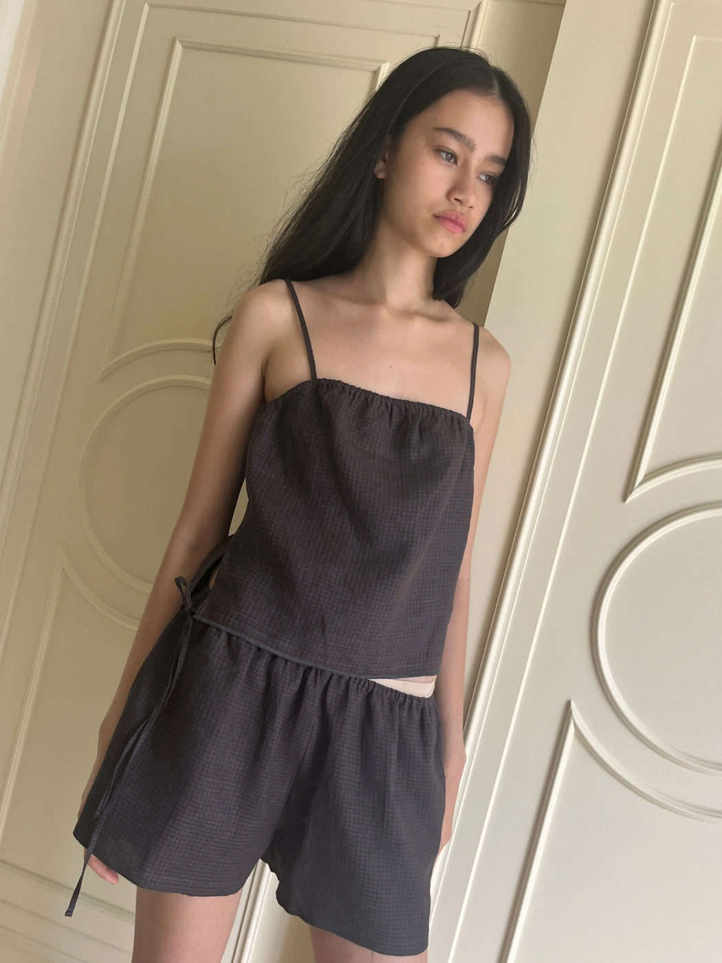Relaxed top features a soft elastic square neckline, fine straps and self-fabric tie closure at side waist pairs back with an easy pull on short, featuring a soft elastic waist and side seam pockets to wear as a set or separately.