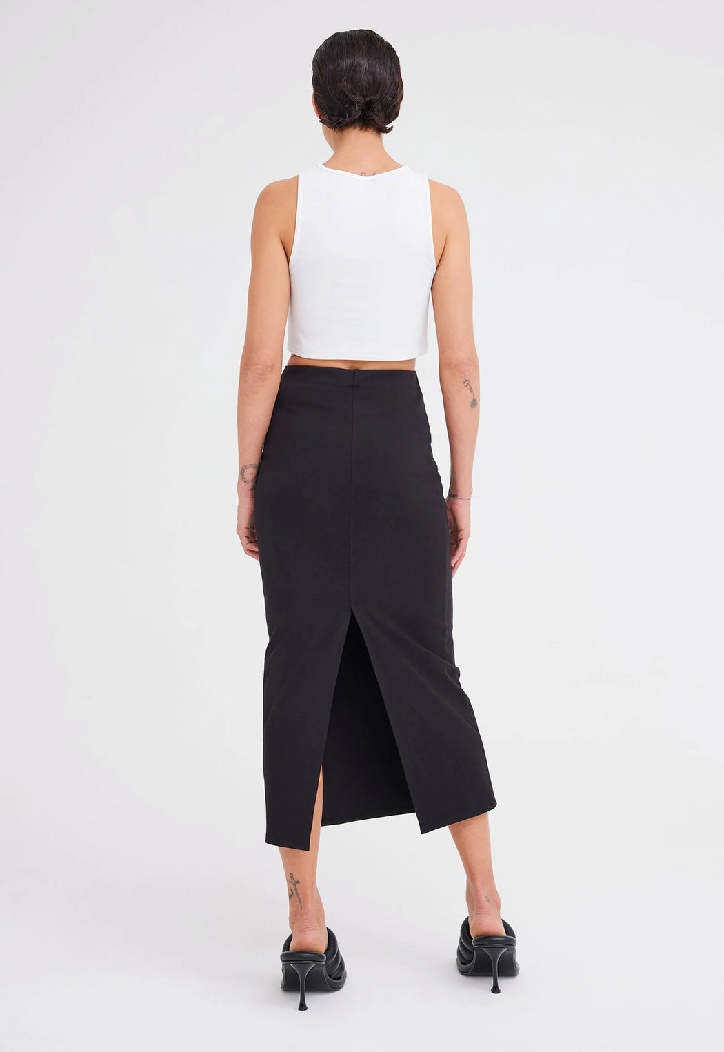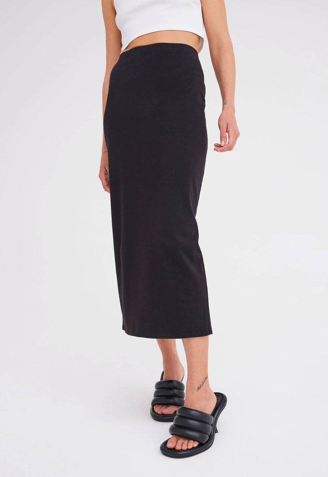 An elevated essential. This ribbed midi skirt is designed to skim and flatter the silhouette. Spun from a fine organic cotton rib jersey and finished with a subtle back split - this piece is the ultimate in elegance and ease.