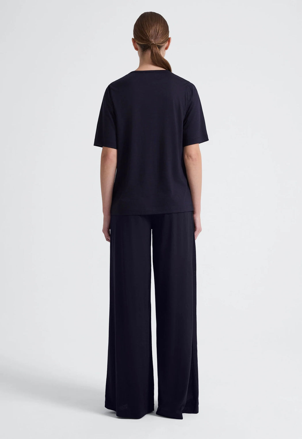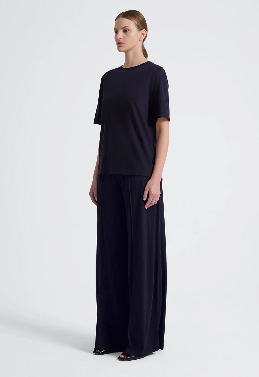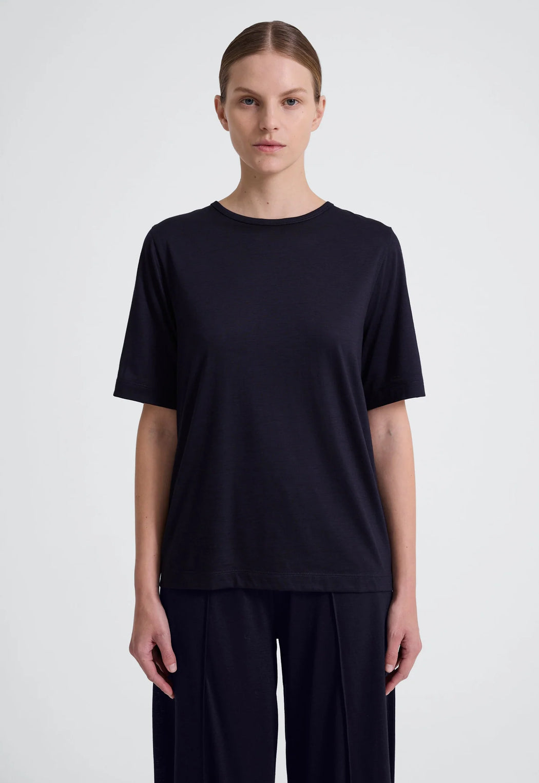 Crafted from an extrafine merino wool jersey, this relaxed oversized tee is comfort and style combined. Details have been kept to a minimum with a simple crew neck and elbow length sleeves, while the decatised finish gives a lustrous hand feel and elegant drape.