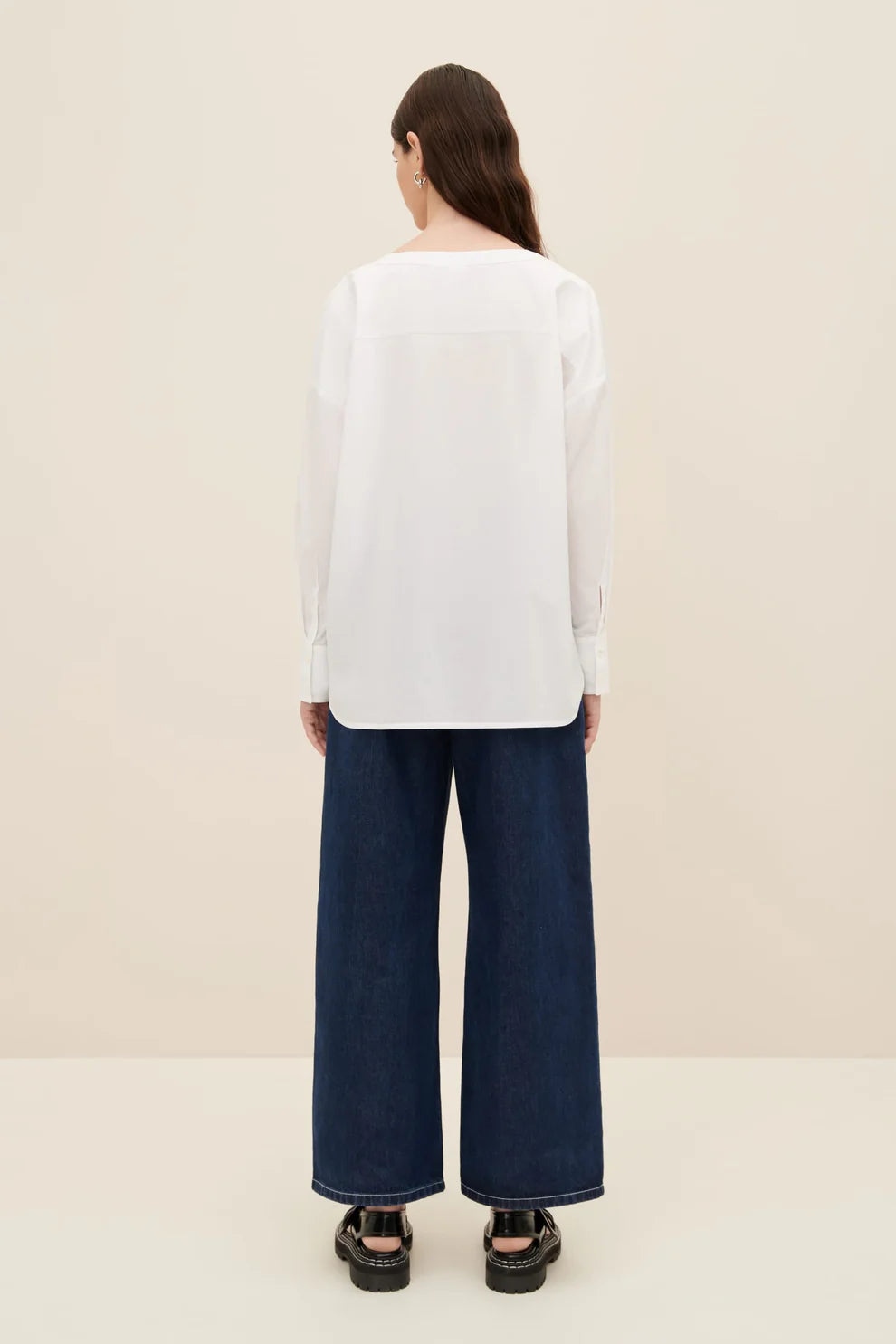 An interpretation of the classic white shirt, made from organic cotton voile. The Isabel Shirt has a relaxed fit with dropped shoulders and an open V neckline. A single pleat at the cuff of the sleeve creates subtle volume, while the deep dual button cuff is a nod to classic detailing. Two patch pockets accents the front, which fastens with shell buttons.