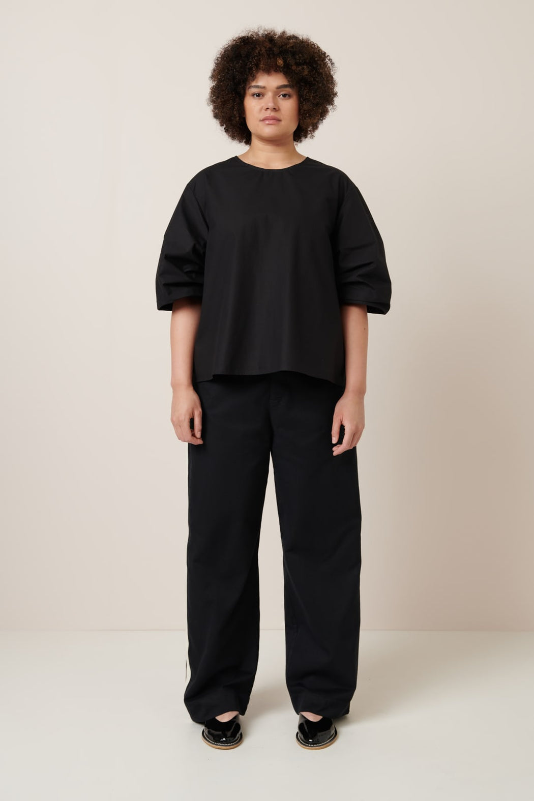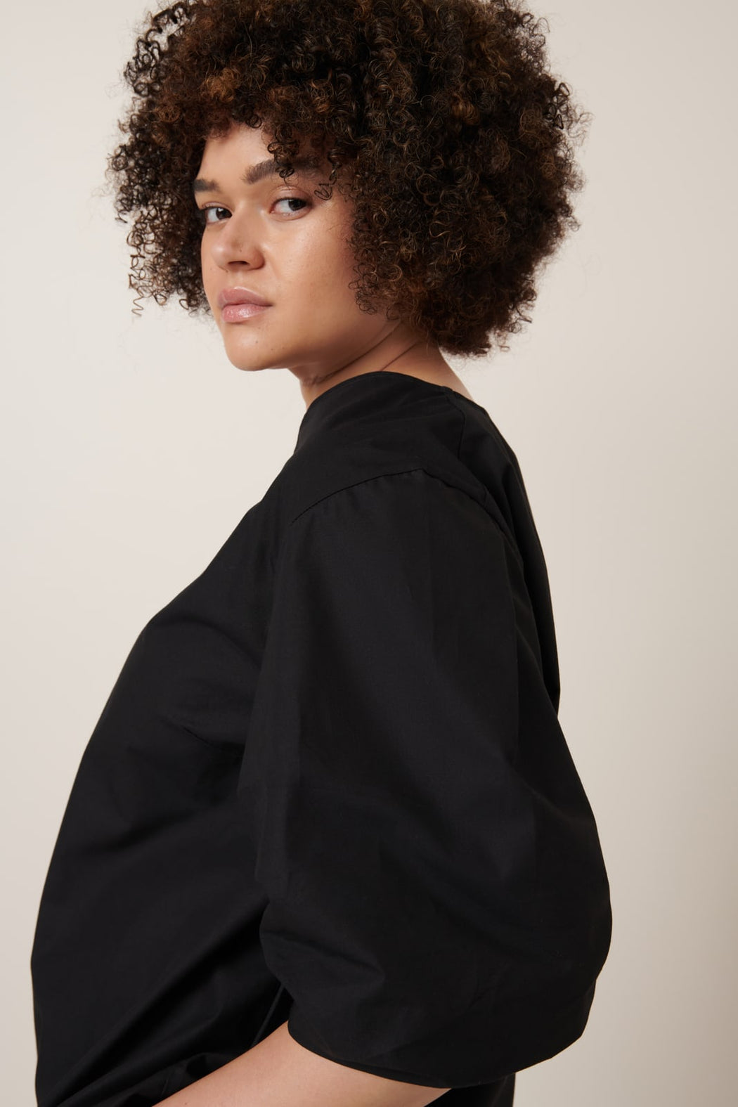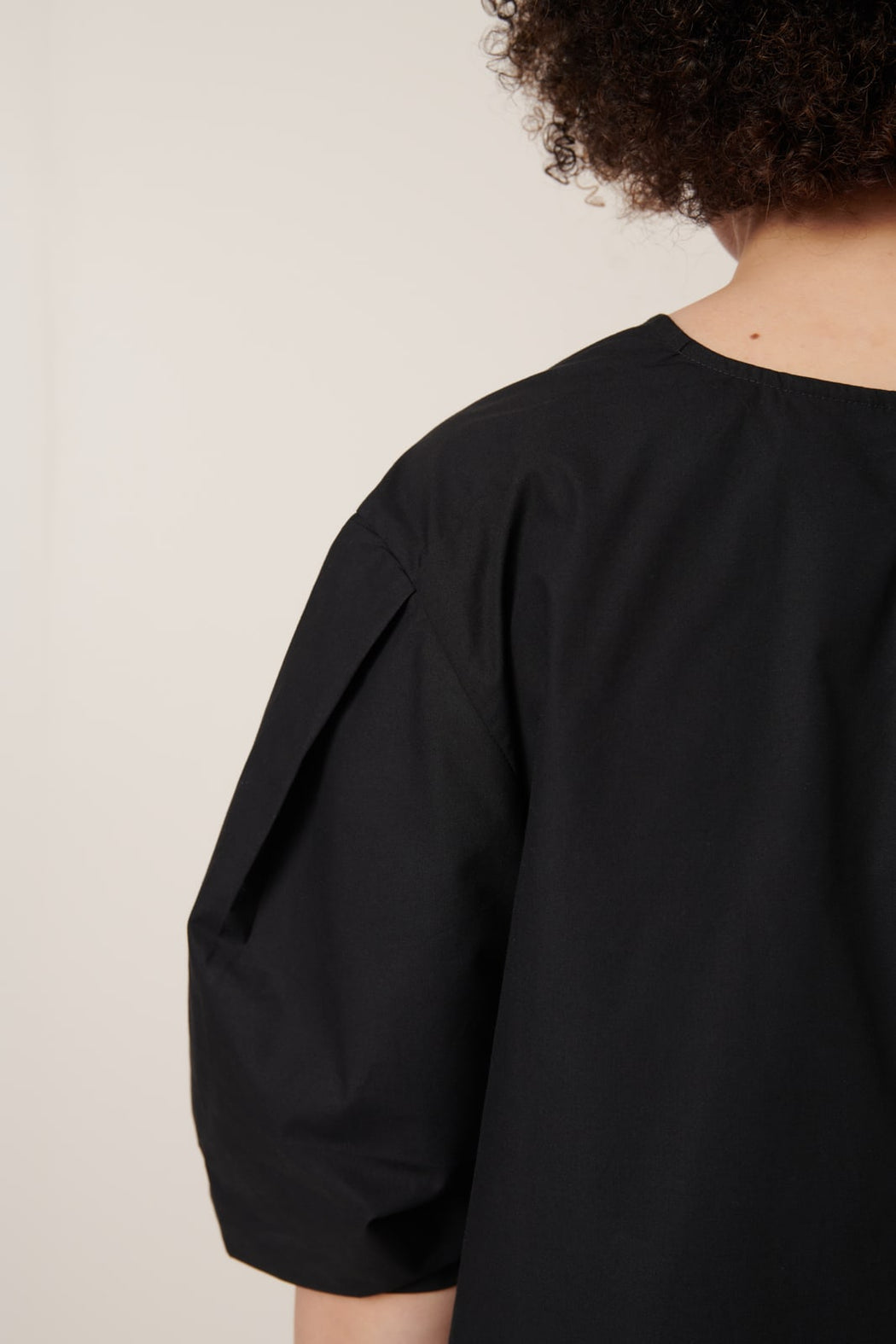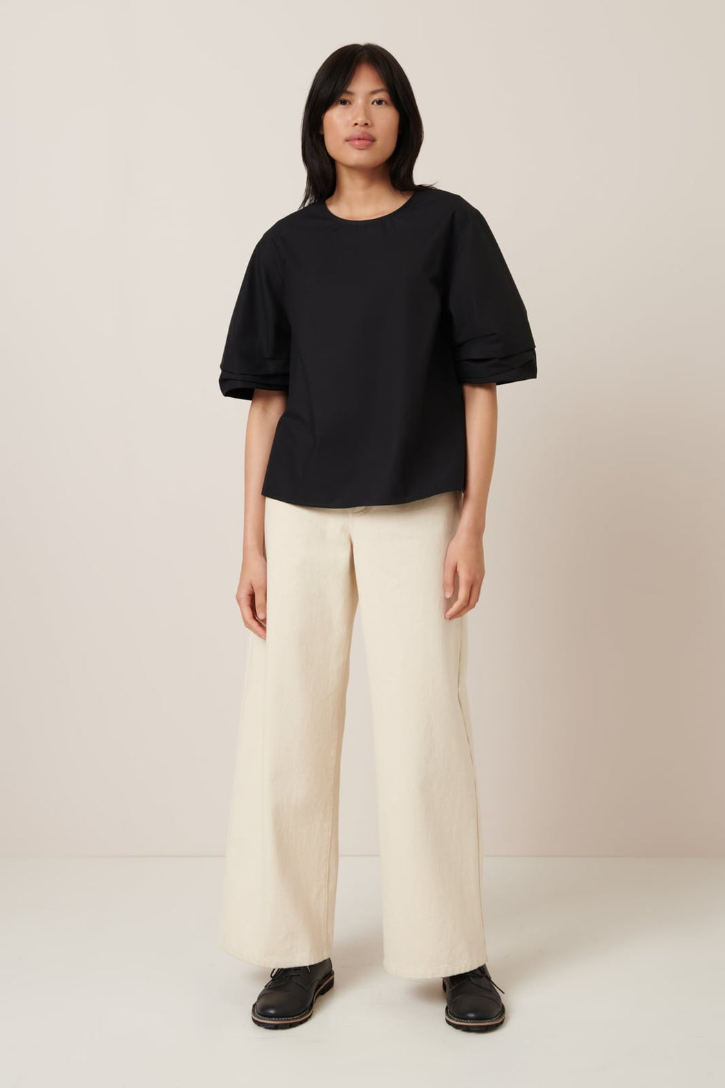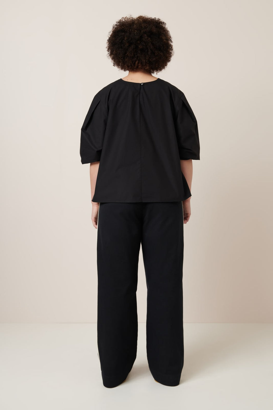 A simple yet statement piece, the Mila Top has a relaxed fit and features a sculptural sleeve, shaped with unique pleating underneath and on top of the sleeve. It has bust darts, falling to a comfortable a-line shape through the body. Made from organic cotton poplin, it is finished with a Mussel shell button closure at the back neck. All Fairtrade organic cotton. All plastic-free.