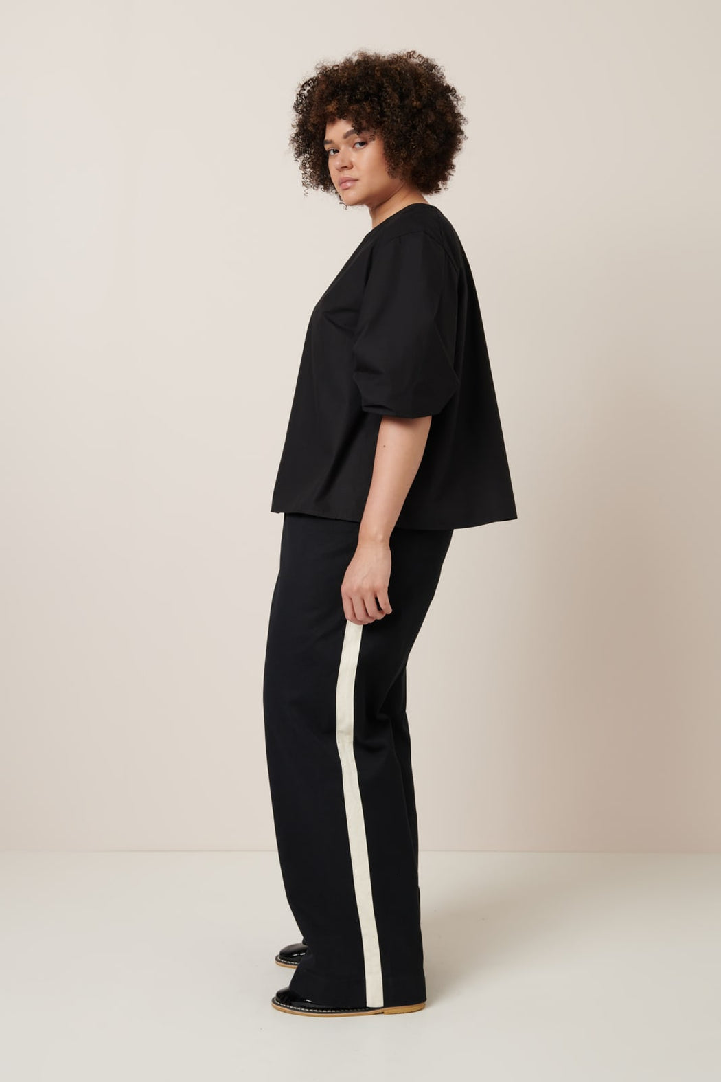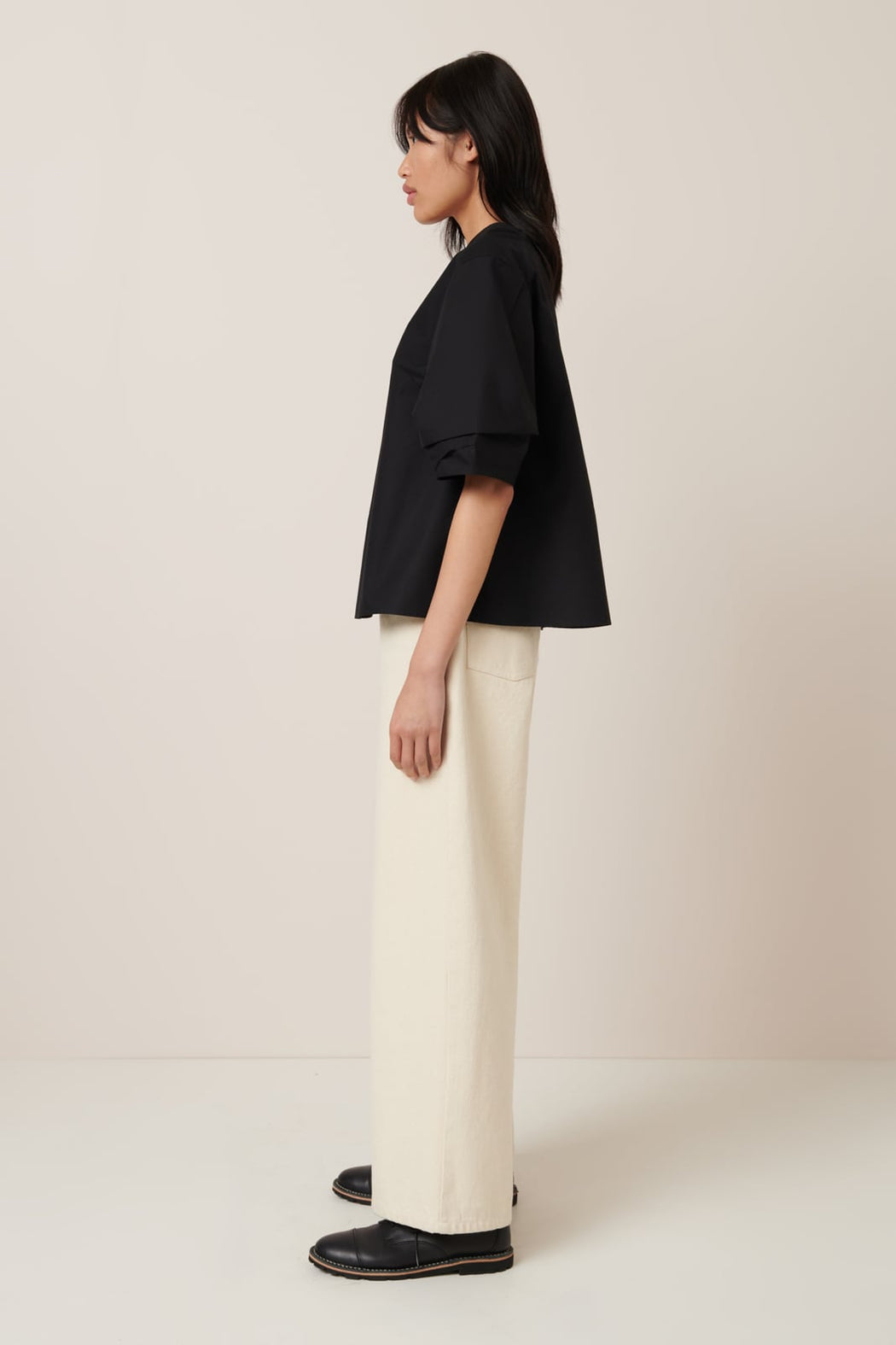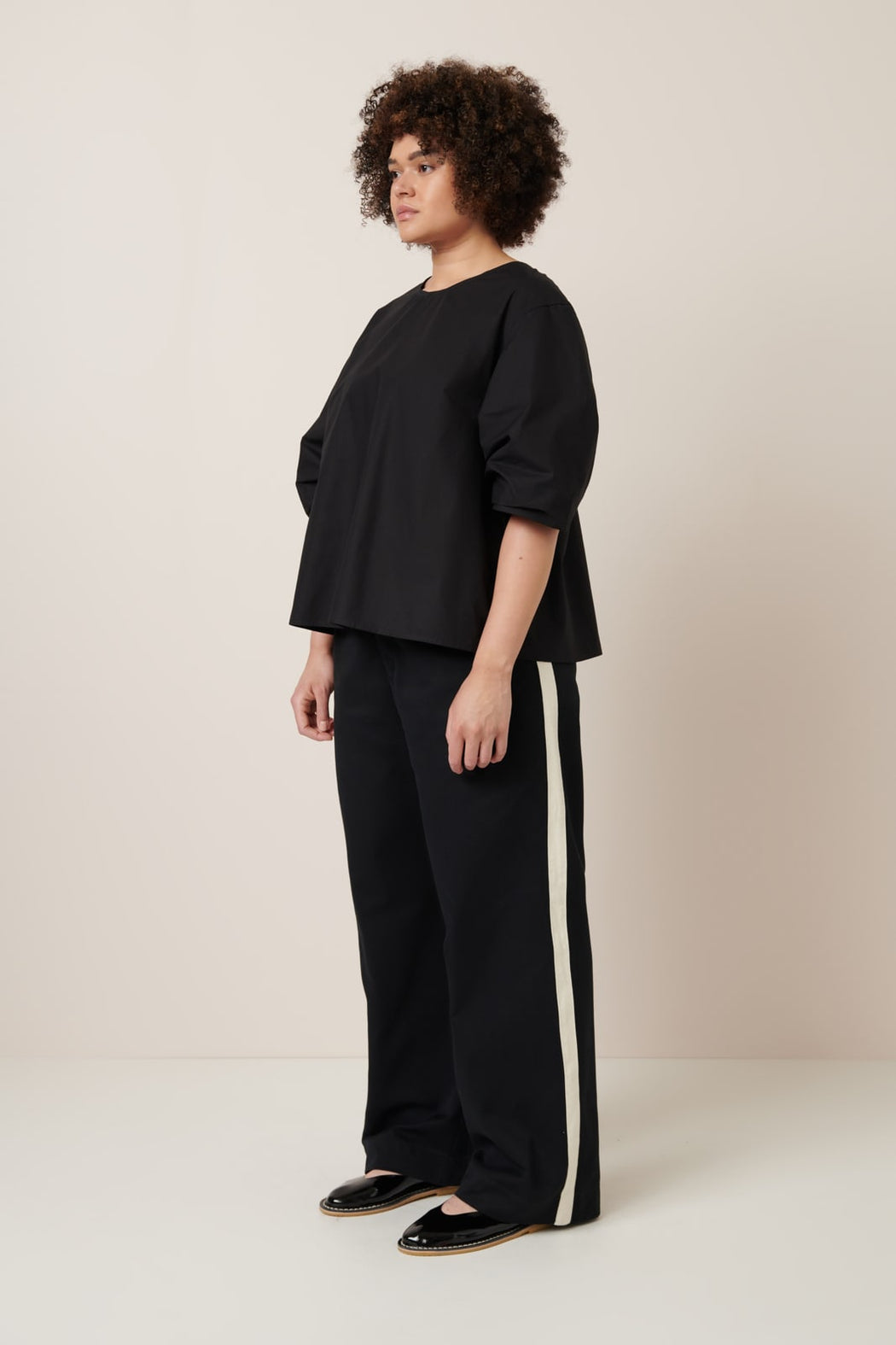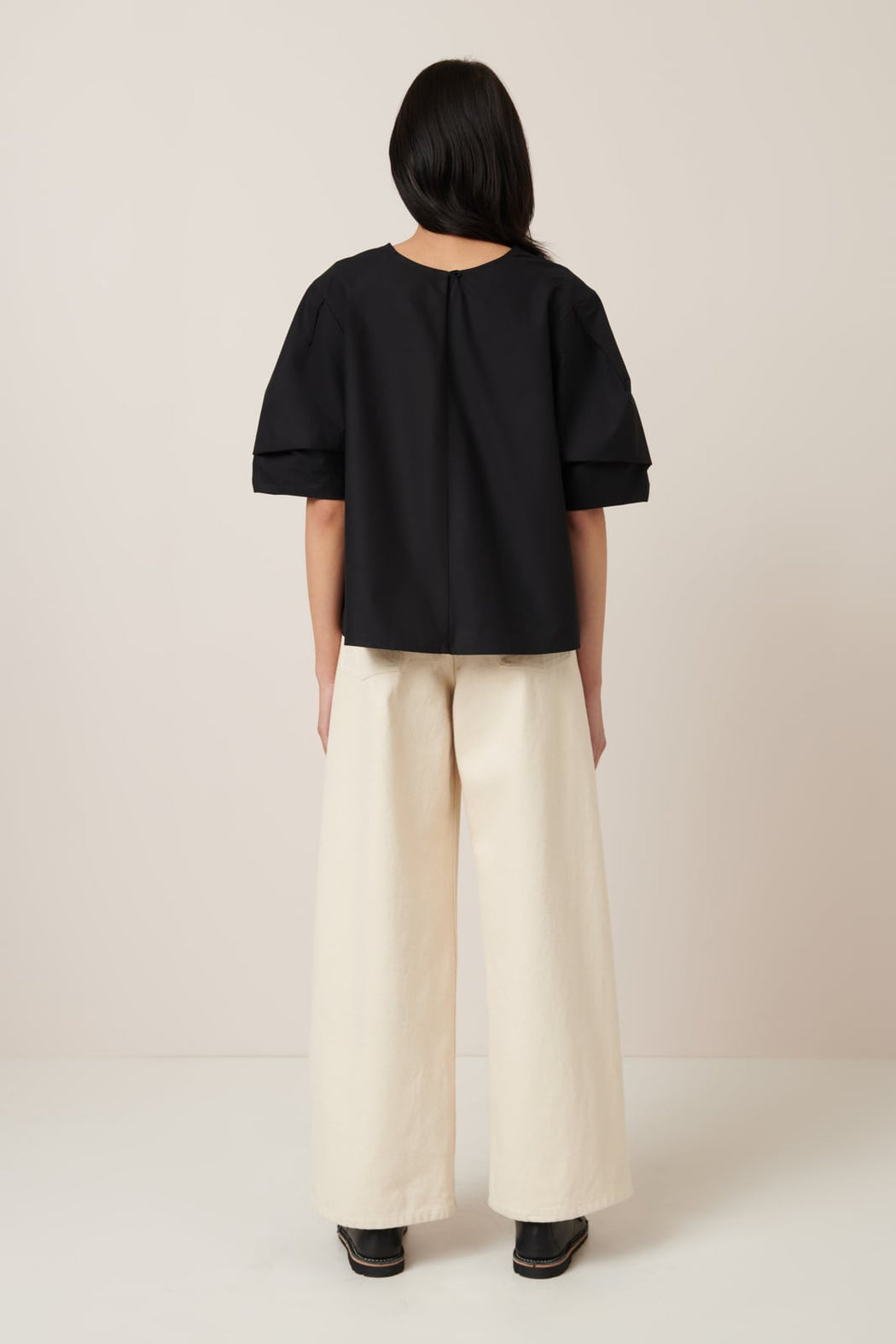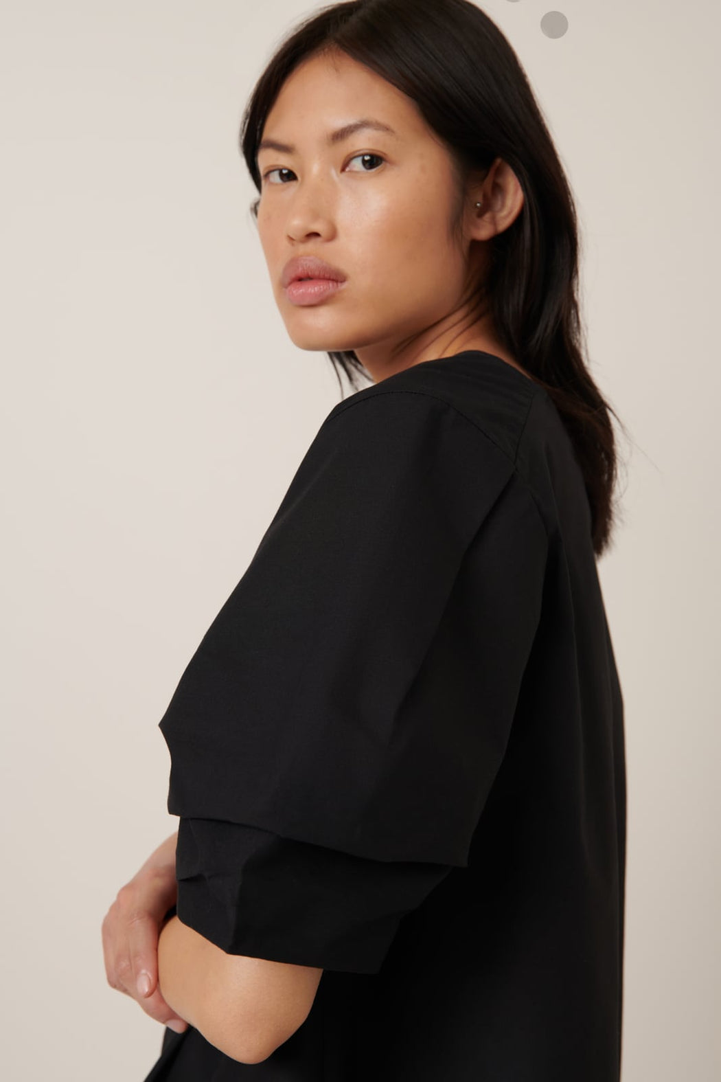 A simple yet statement piece, the Mila Top has a relaxed fit and features a sculptural sleeve, shaped with unique pleating underneath and on top of the sleeve. It has bust darts, falling to a comfortable a-line shape through the body. Made from organic cotton poplin, it is finished with a Mussel shell button closure at the back neck. All Fairtrade organic cotton. All plastic-free.