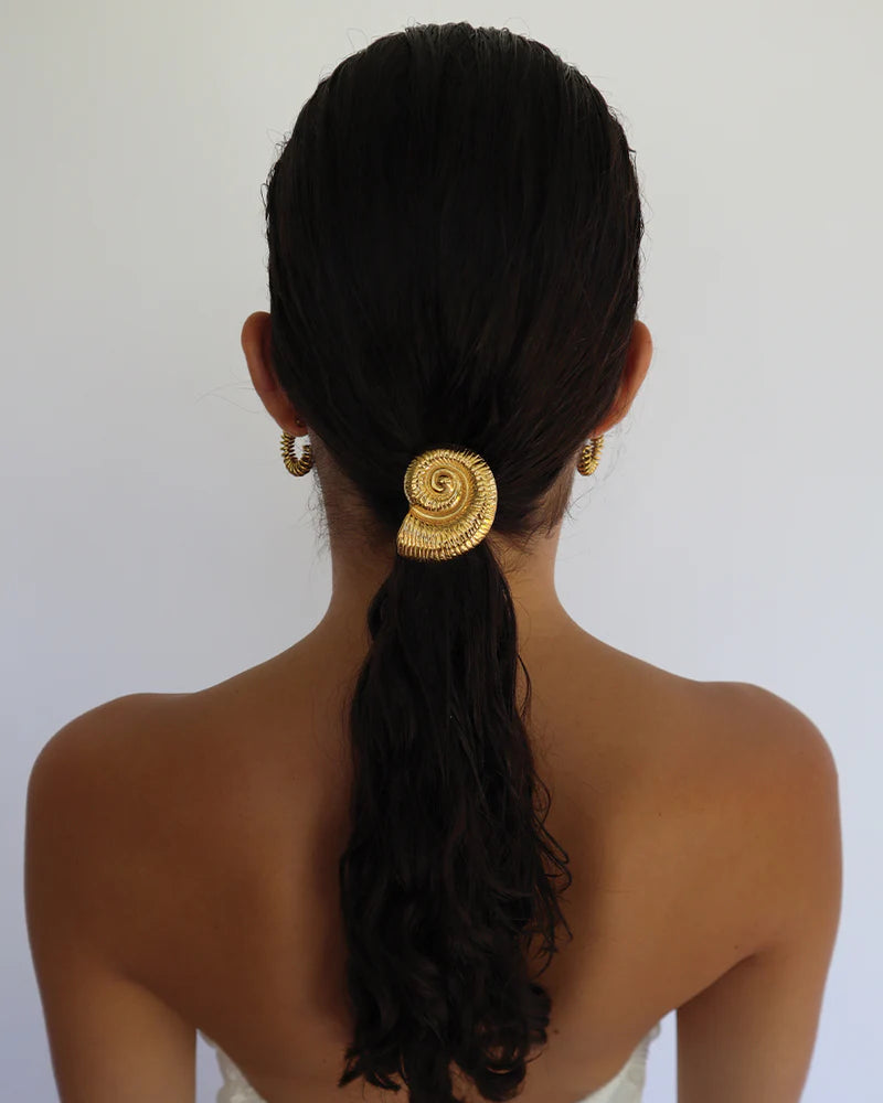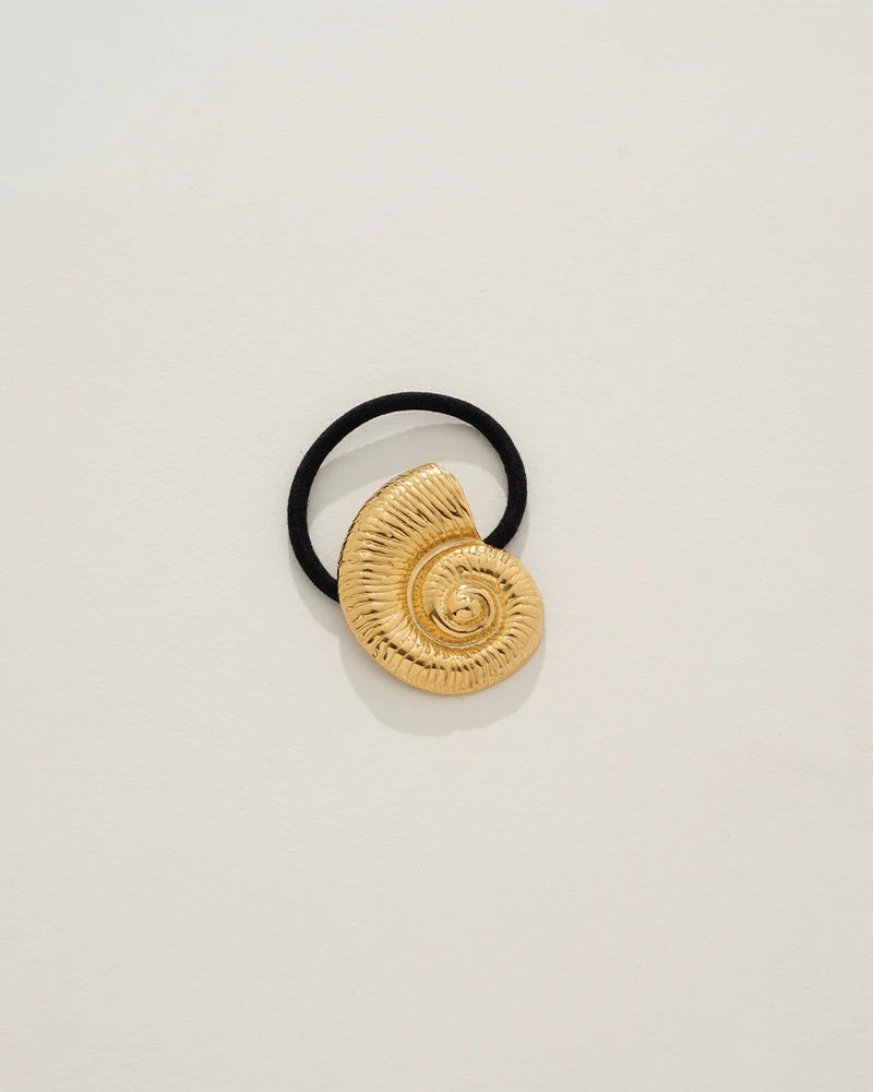 Wrap your hair in coastal elegance with the Liora Hair Tie. The bold PVD gold-plated seashell at its centre transports you to sun-kissed shores, adding a hint of oceanic charm to your everyday style. The sleek black elastic keeps your hair securely in place, while the seashell catches the light with every turn, turning an ordinary hair tie into a statement accessory. Whether you're pulling your hair up for a beach day or adding a unique twist to your evening look, this piece is the perfect fusion of practicality and playful luxury. Make waves with the Liora Hair Tie—your new favourite way to accessorise.