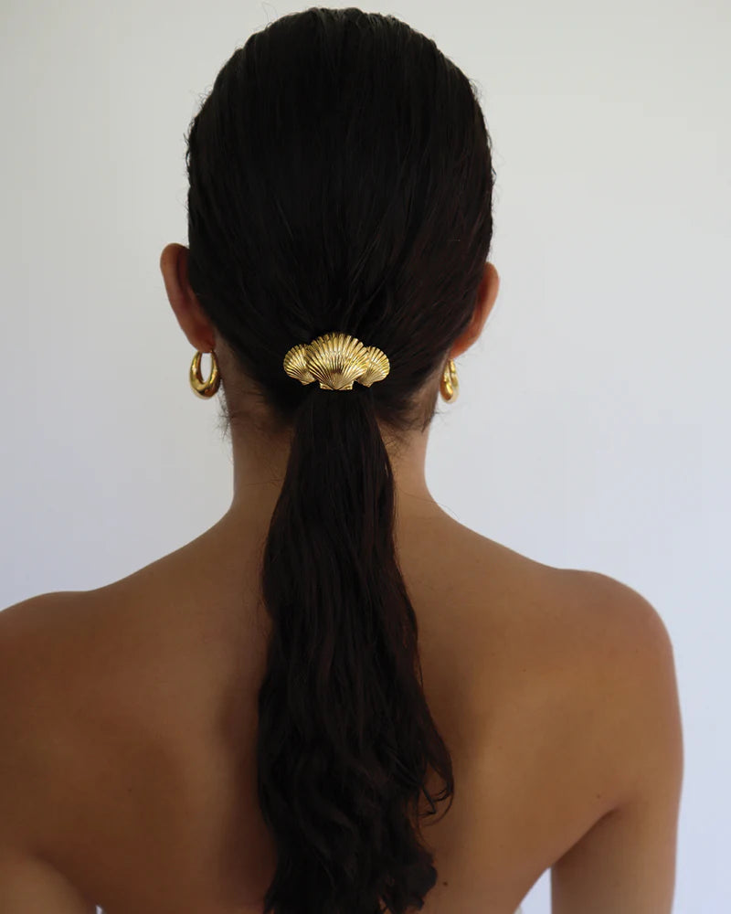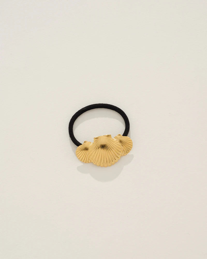 Wrap your hair in coastal elegance with the Ziva Hair Tie. Featuring three stunning PVD gold-plated seashells at its centre, this hair tie evokes the beauty of sun-drenched shores, adding a touch of oceanic charm to any look. The sleek black elastic keeps your hair securely in place, while the trio of seashells catches the light with every movement, transforming a simple accessory into a bold statement piece. Whether you're pulling your hair back for a beach day or giving your evening look a unique twist, the Ziva Hair Tie seamlessly blends practicality with playful luxury. Make waves with this irresistible piece—your new favourite way to accessorise.