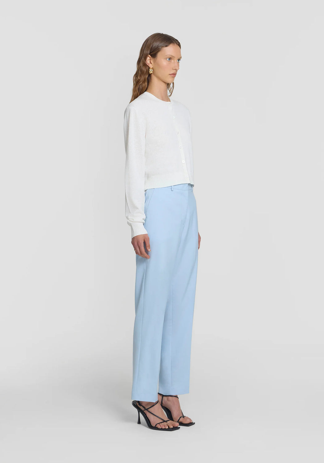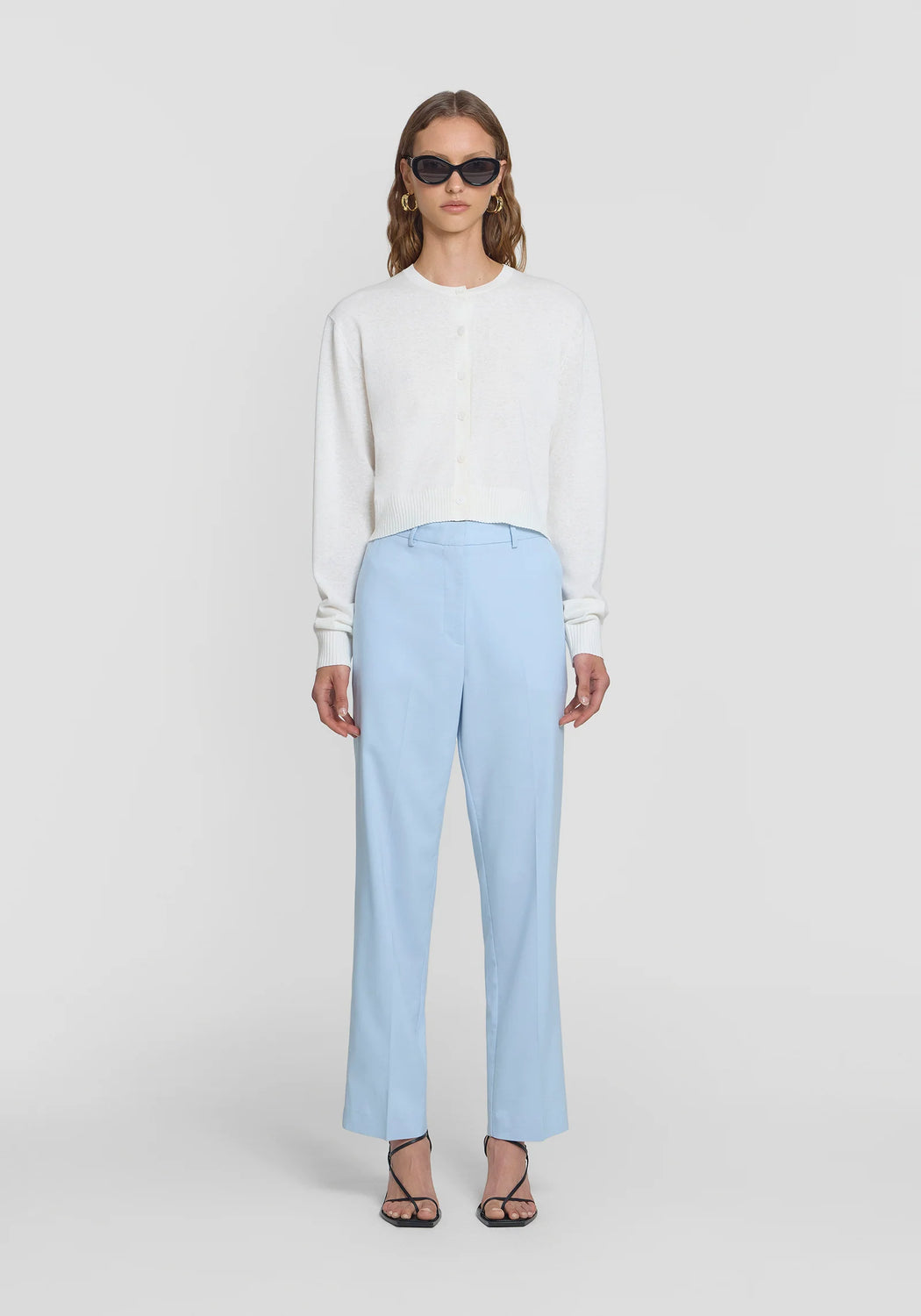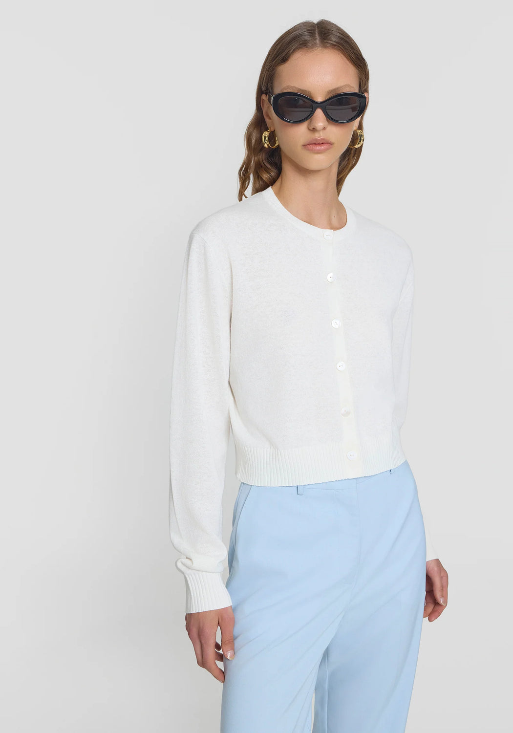 Introducing the Divergent Cardi, crafted from a lightweight ivory cotton-linen blend. Constructed in a jersey stitch knit, detailed with premium logo-adorned buttons and a cropped, relaxed fit. An essential knit for warmer months, finished with a crew ribbed neckline, cuffs, and hem. Layer it over summer dresses on balmy nights or pair with denim for effortless everyday wear.