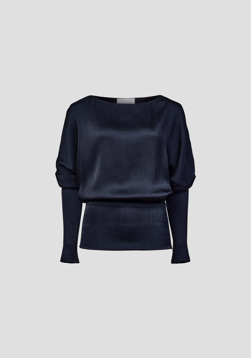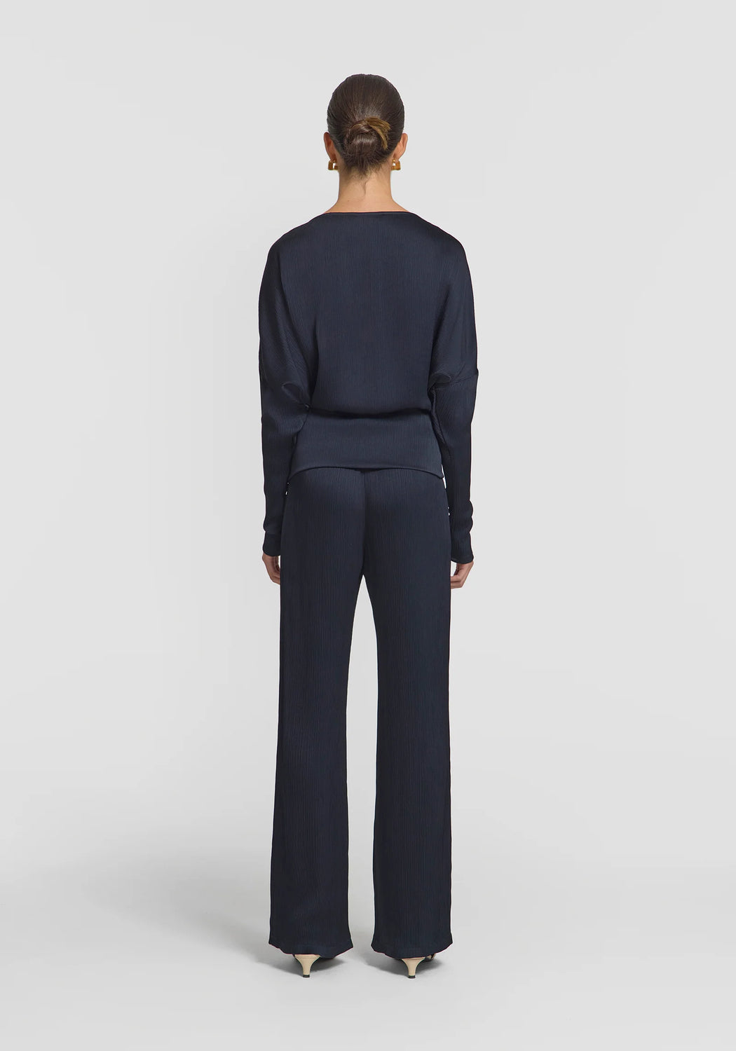 The Solomon Top embodies understated sophistication, crafted from softly pleated satin in a classic navy hue. Featuring a soft boat neckline, it’s fitted through the waist and sleeves, offering a flattering, feminine silhouette. For a set dressing moment, complete the look with the Turner Pant, or pair with black or denim for effortless sophistication.