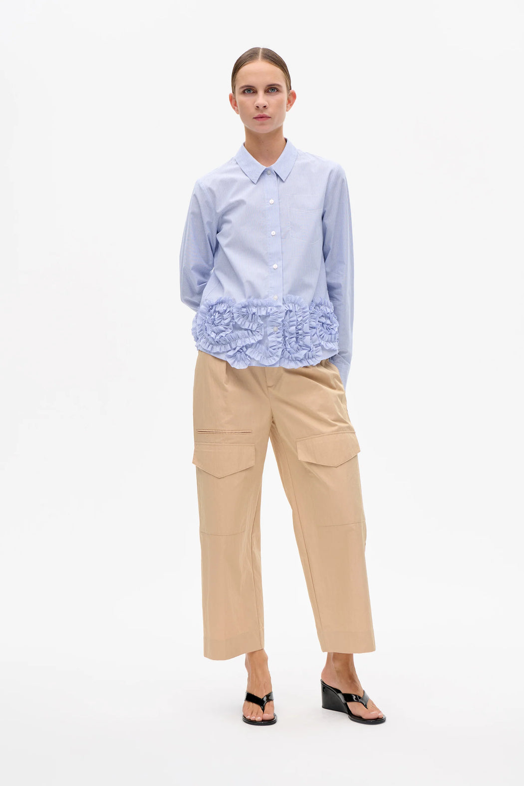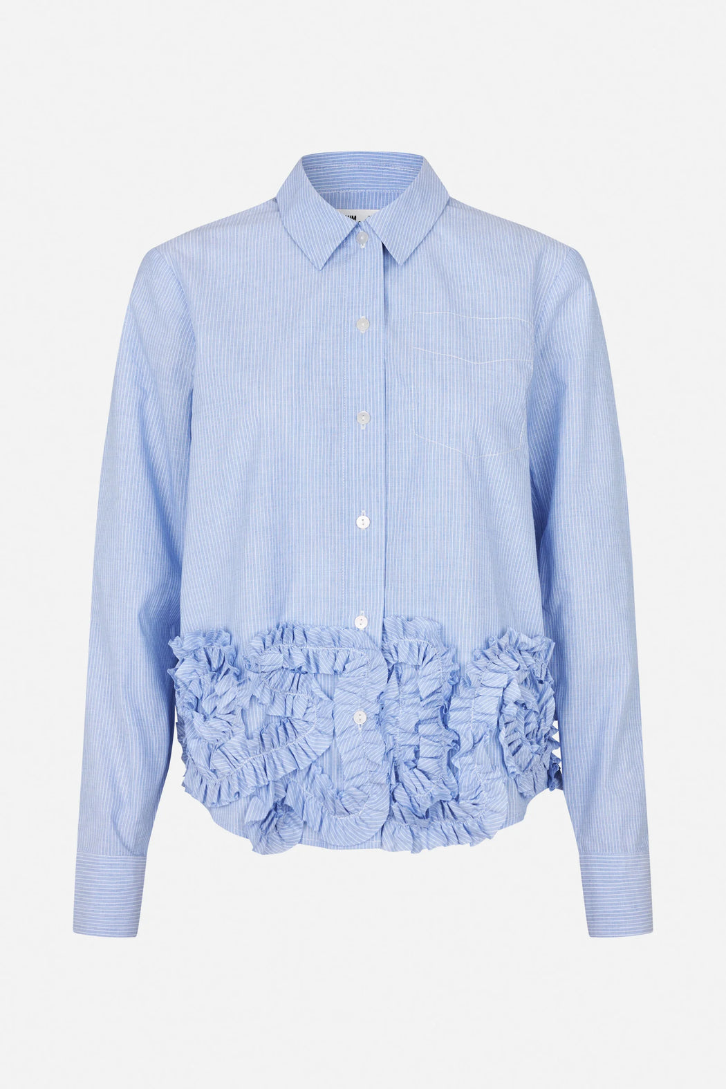 The Mariel Shirt is made in organic cotton poplin. The shirt has a unique frill design shaped like rosettes above the hemline. It has a comfortable loose fit with a classic collar and button closure. As a subtle detail, the shirt has a faux pocket made of decorative stitching.