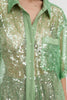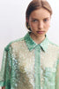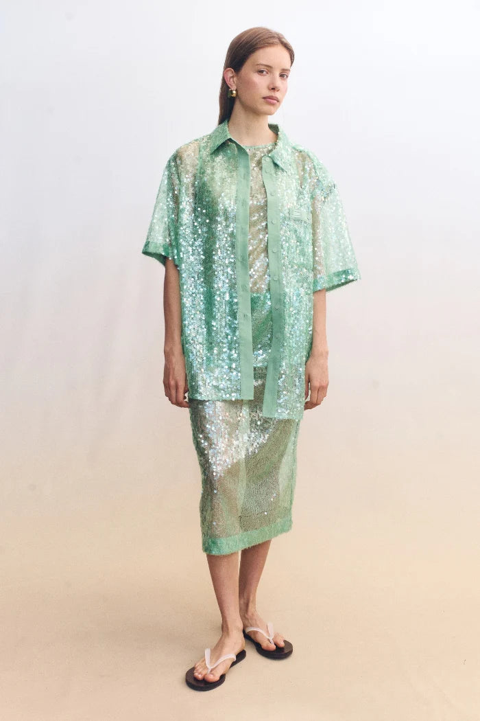 Shimmering like a mirage, the Luma Shirt in Green has a presence you cannot ignore. Short sleeves, a button-down front and a sheer sequin finish catch every shift of light. She carries a soft, fluid energy that makes every moment feel like it should be remembered.