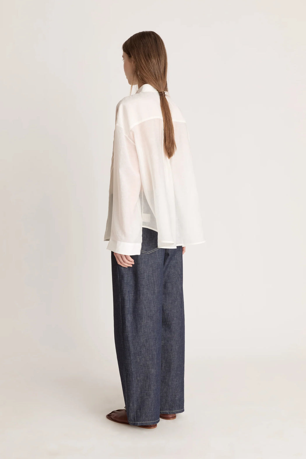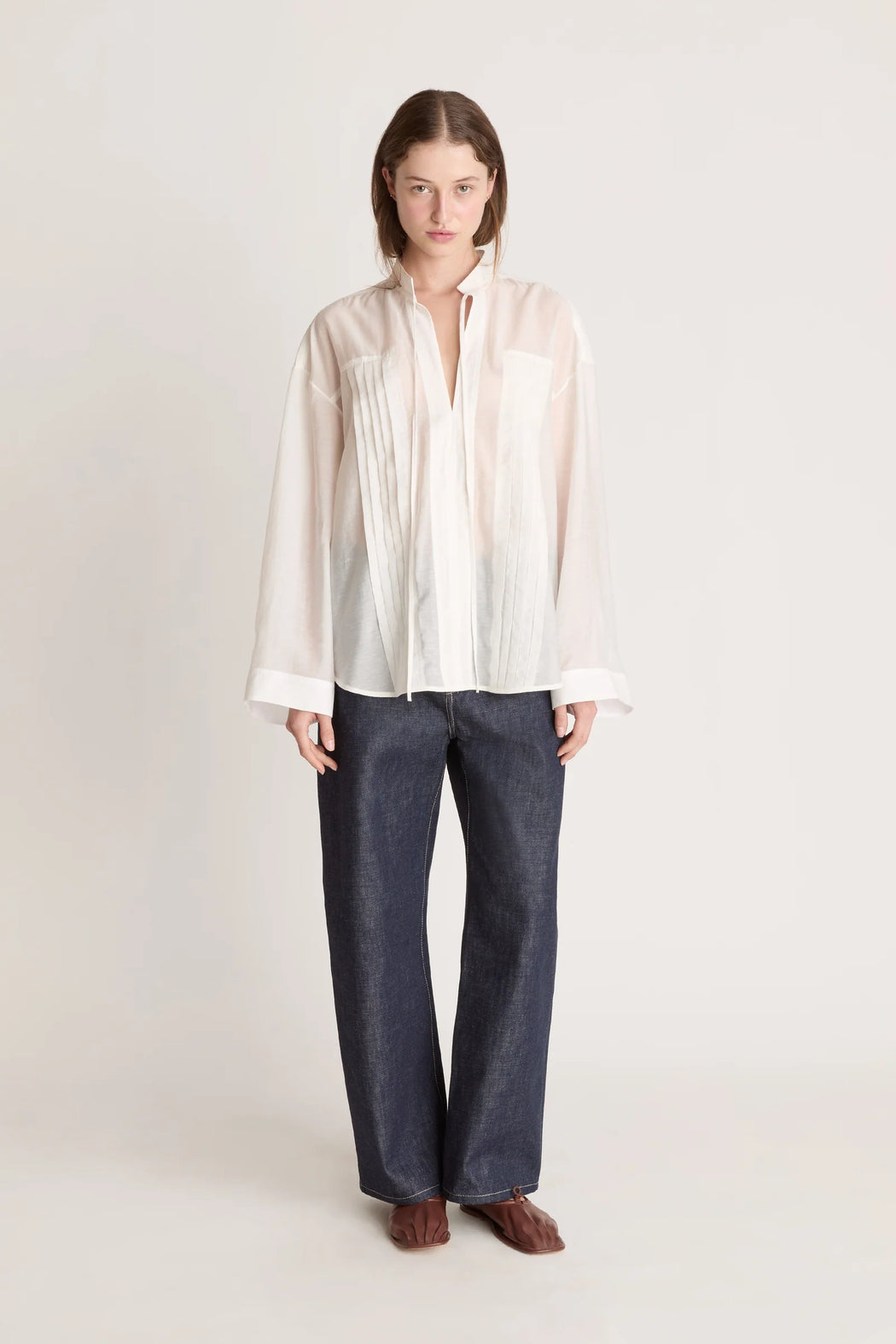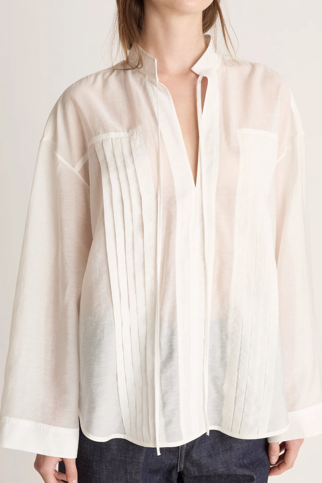 A relaxed, long sleeve v-neck shirt in a soft tencel blend. Detailed with neck ties and pintucks from yoke to hem.