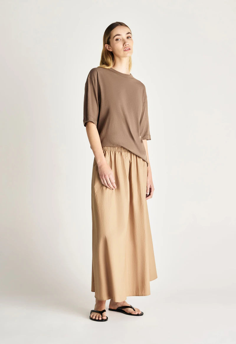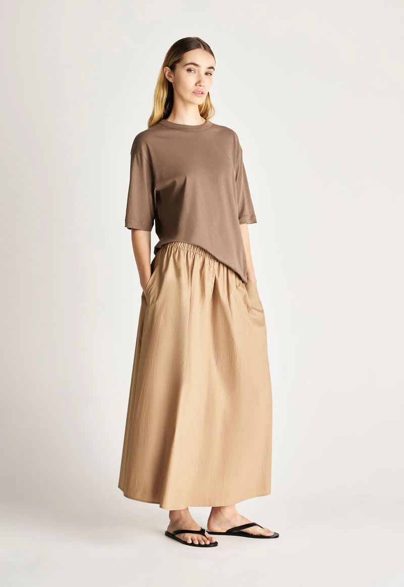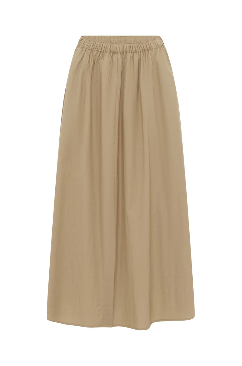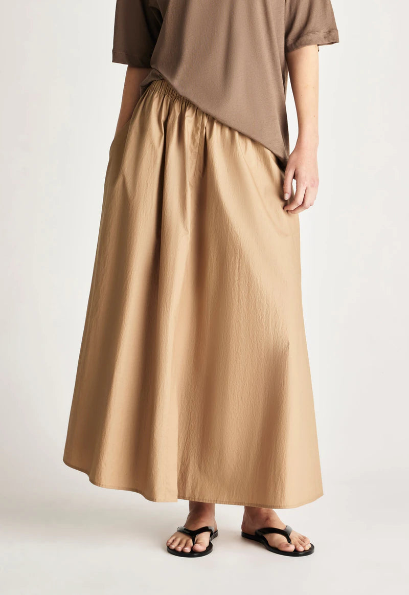 Fluid and softly structured, our Brax Skirt is designed for ease and movement. Falling to mid-calf, this longline silhouette features a gathered waistband and subtle panel detailing to create gentle volume. Designed to sit low on the hips for a slouched, relaxed look, though it can be worn higher on the waist if preferred. Finished with side seam pockets and fully lined in lightweight cotton poplin, it's an elevated essential with quiet refinement.