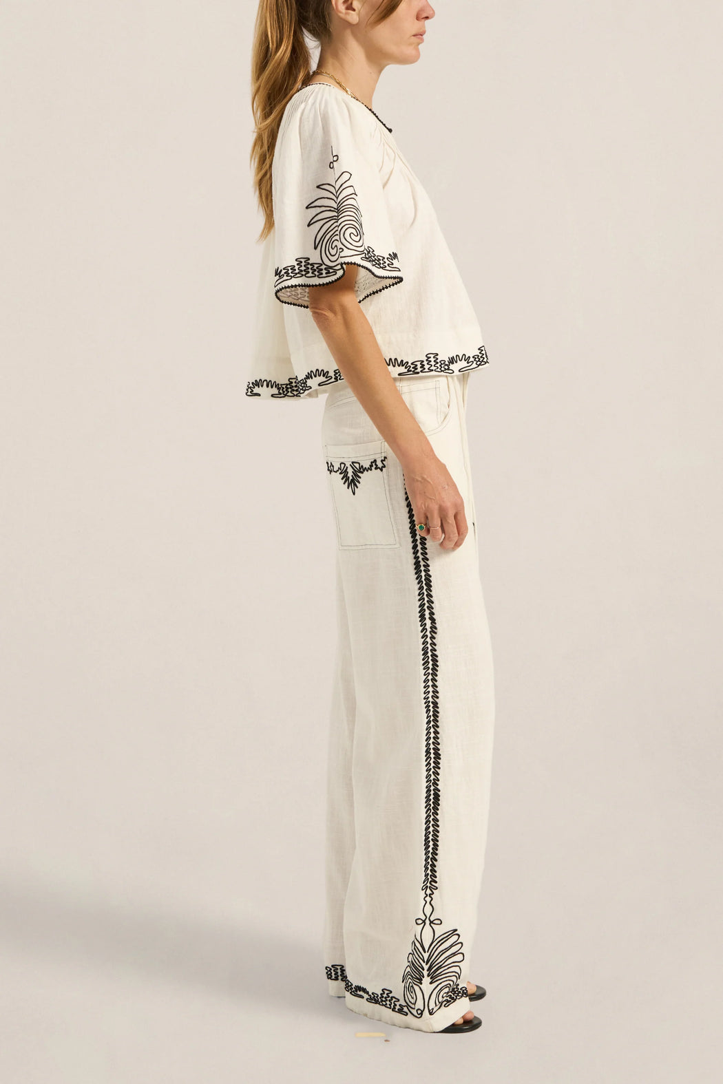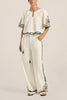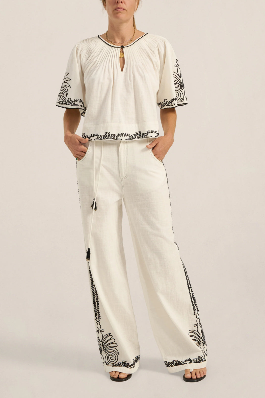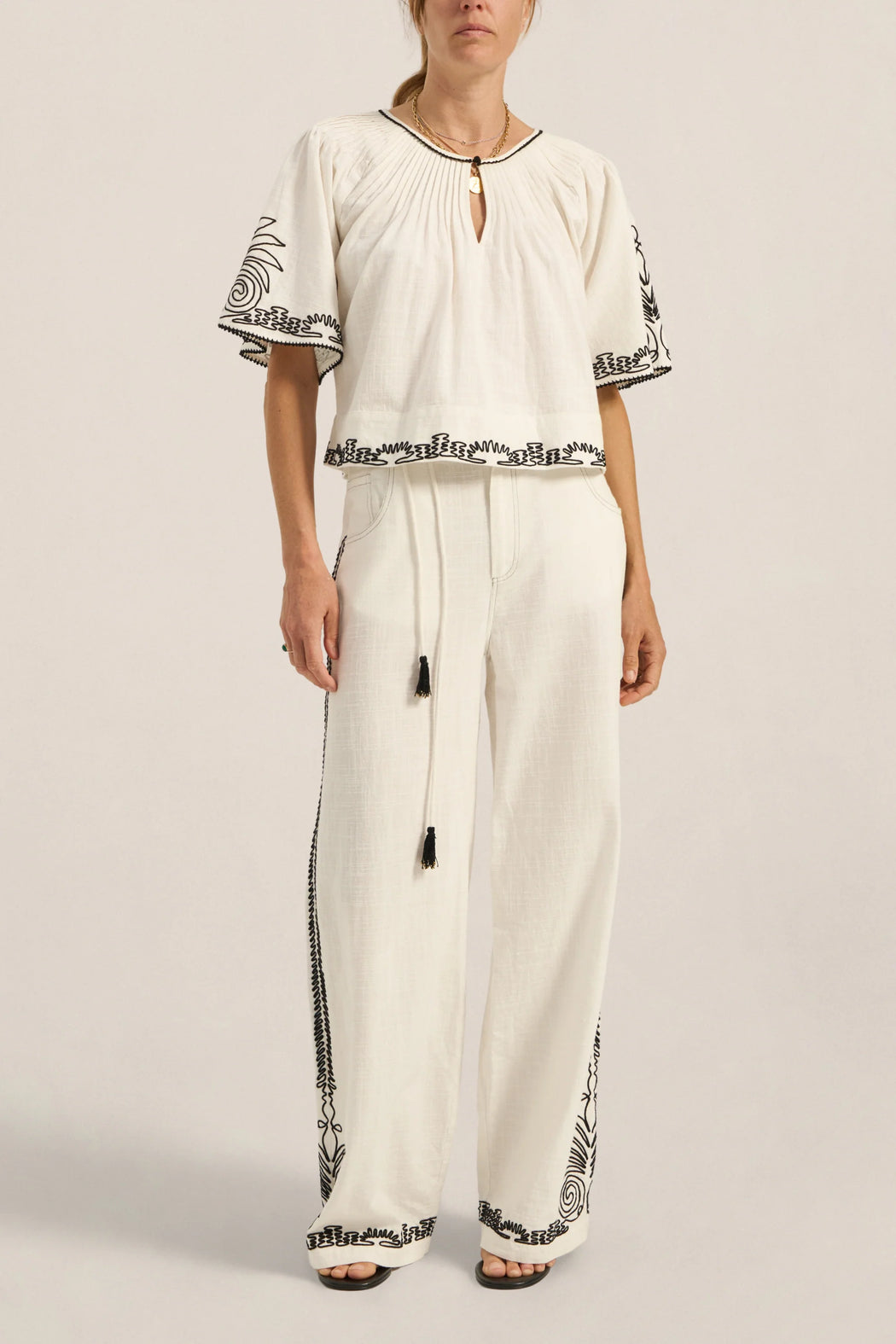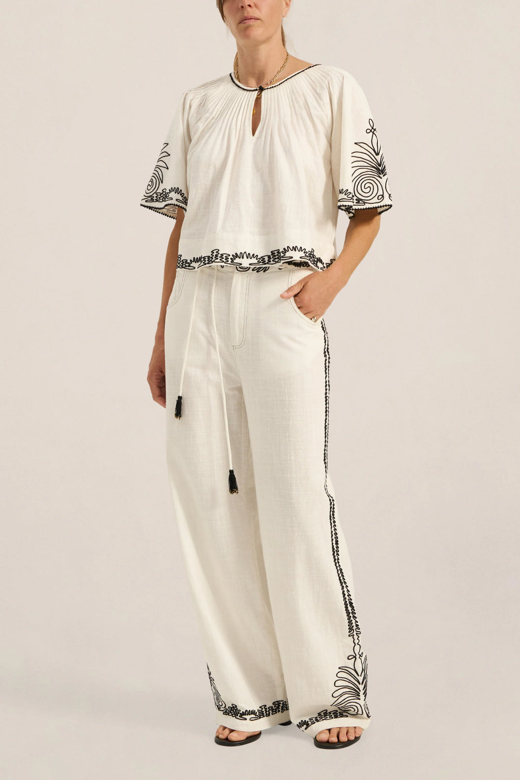 and striking detail. Crafted from a soft cotton slub fabric, it offers a lightweight, breathable feel with a naturally textured finish that drapes effortlessly on the body. Intricate Dori embroidery in a bold black-on-white contrast delicately traces the hem and sleeves with ornate detailing, framing the silhouette with considered artistry. Created with precision, the manually applied cording delivers a richly textured and tactile embroidery finish, each line carefully guided to achieve depth and definition. Designed with a softly gathered neckline and relaxed short sleeves, the Calliope Top falls with ease, making it a versatile piece that transitions seamlessly from day to evening.