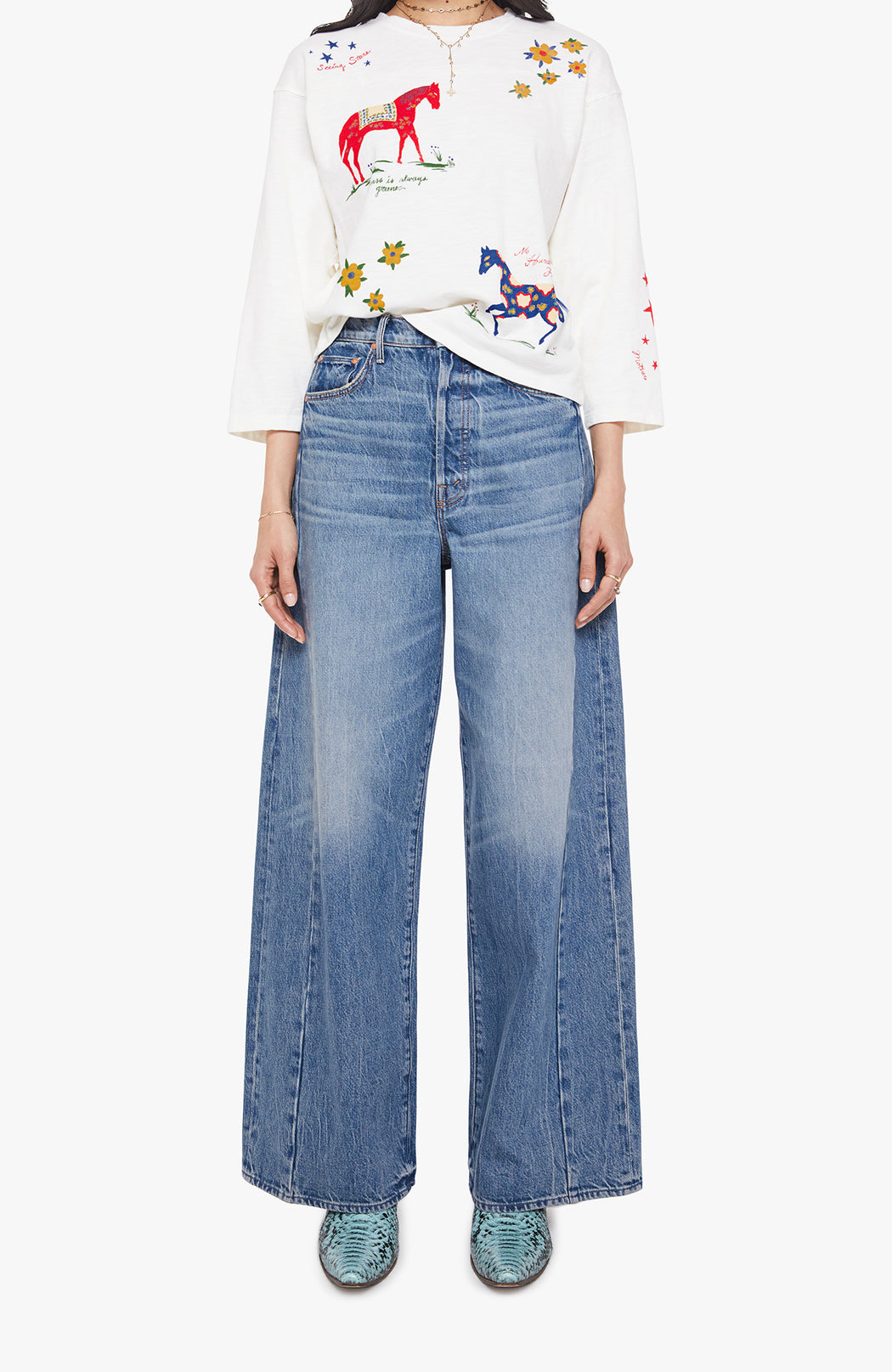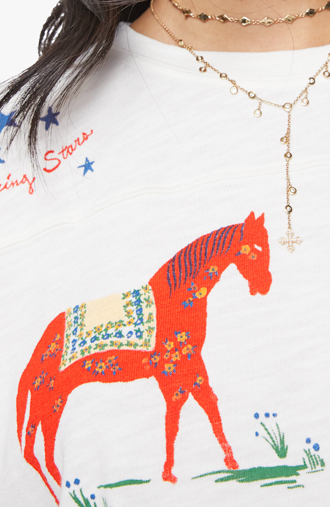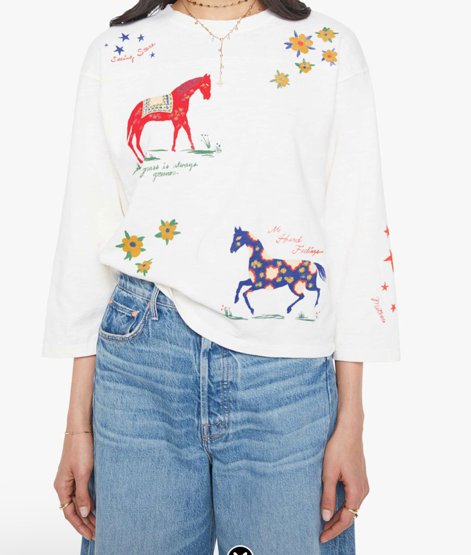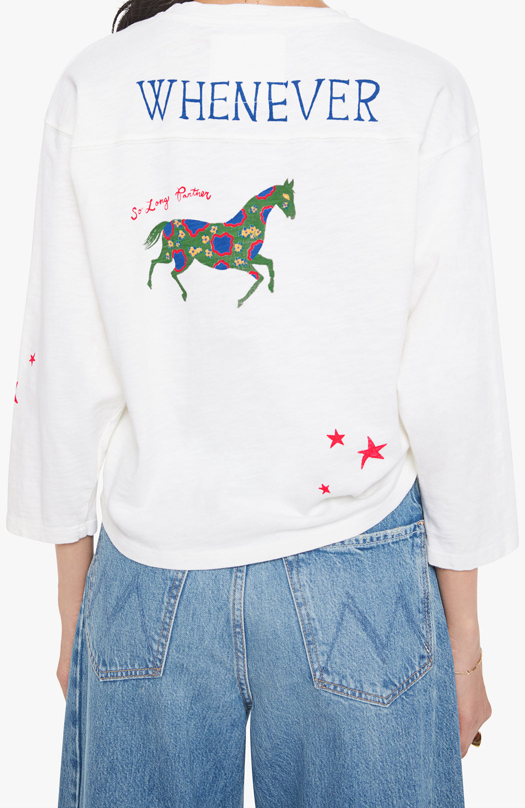 Free spirit. Inspired by a football jersey, this oversized crewneck tee is designed with drop shoulders, 3/4 sleeves and a boxy fit. Made from a SUPERIOR blend of cotton and linen in white, The Footballer in Whenever features horse and flower graphics throughout and text in blue on the back.